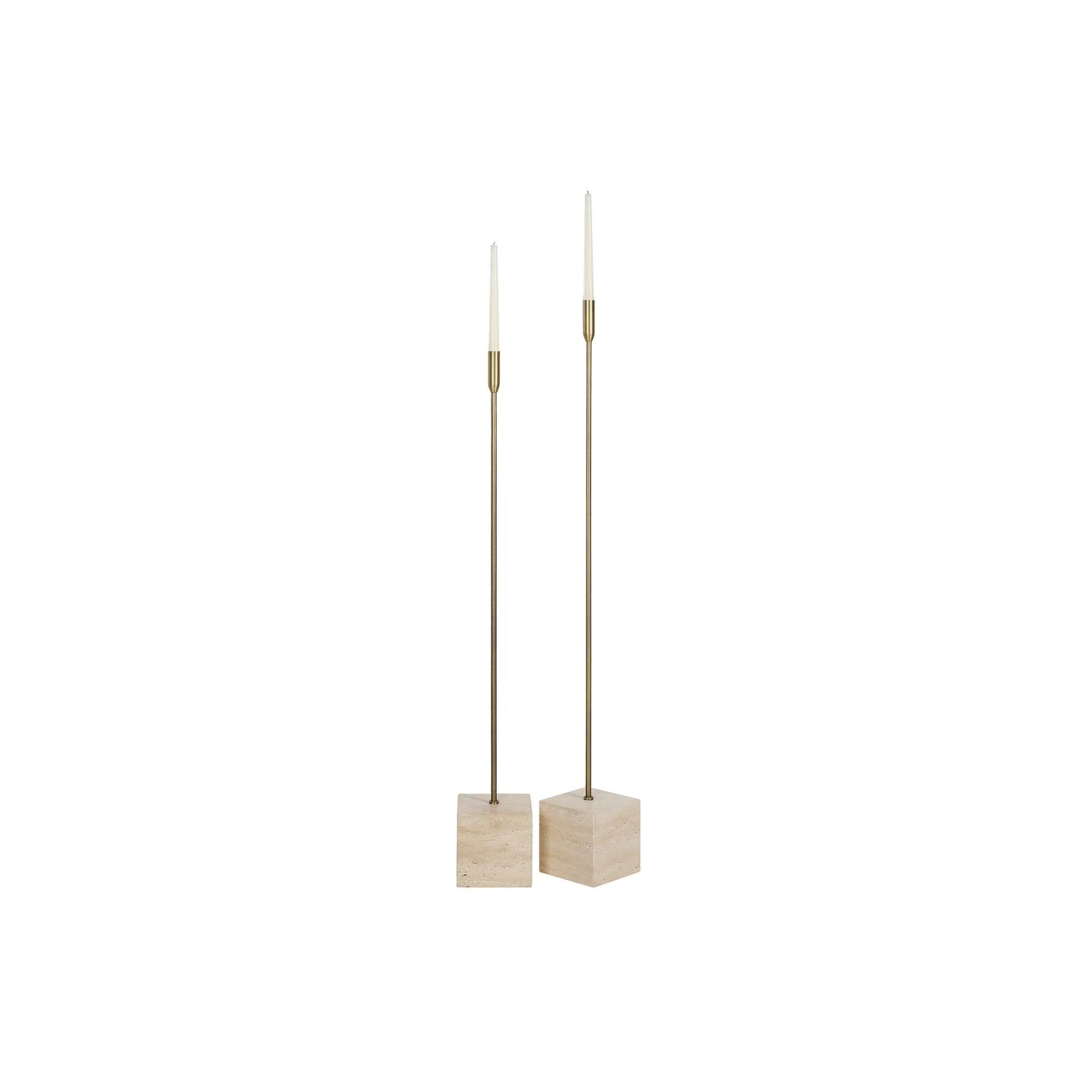 Create visual harmony in your chosen room with this striking duo of long and lean floor candle holders. Luxurious travertine and brushed brass come together to bring a touch of opulence to modern decorating schemes. Place them next to a fireplace or sofa with sleek taper candles for an added layer of cozy charm.