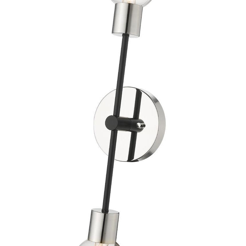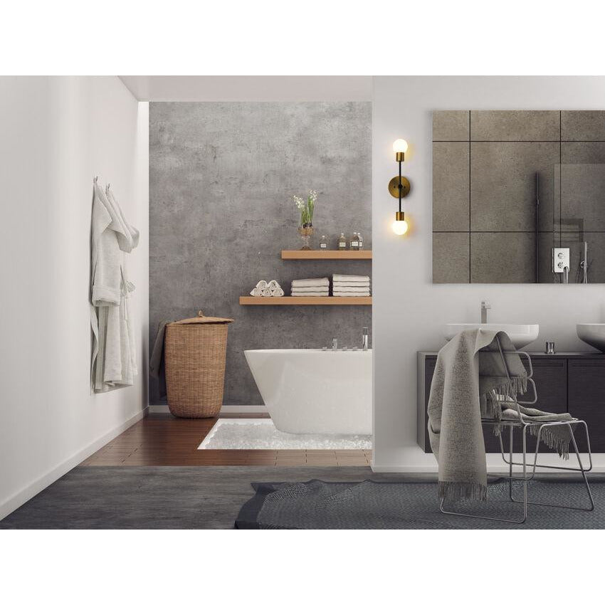 This stylish two-light wall sconce lends a mid-century modern flair with a subtle Art Deco vibe. Ideal for a contemporary master suite, this dual pendant wall sconce features a steel structure, complete with polished foundry brass and matte black finishes. In addition, this wall sconce lends a soft, soothing glow with its two stacked opal globes.