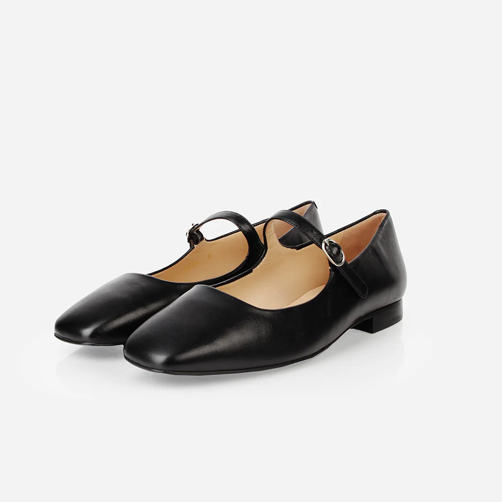 En pointe style, always. A sweet, square-toed ballet flat completes every look. Poised and polished with trousers and dresses. Just done up enough with denim. Secured with an adjustable strap.