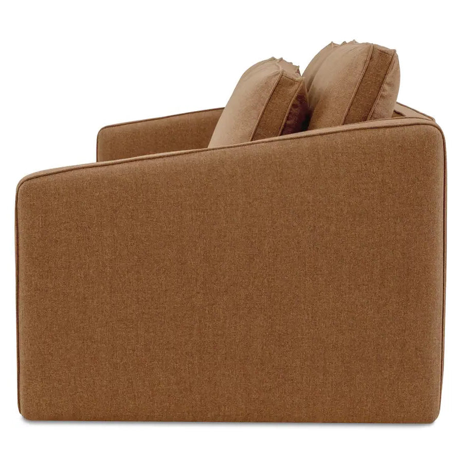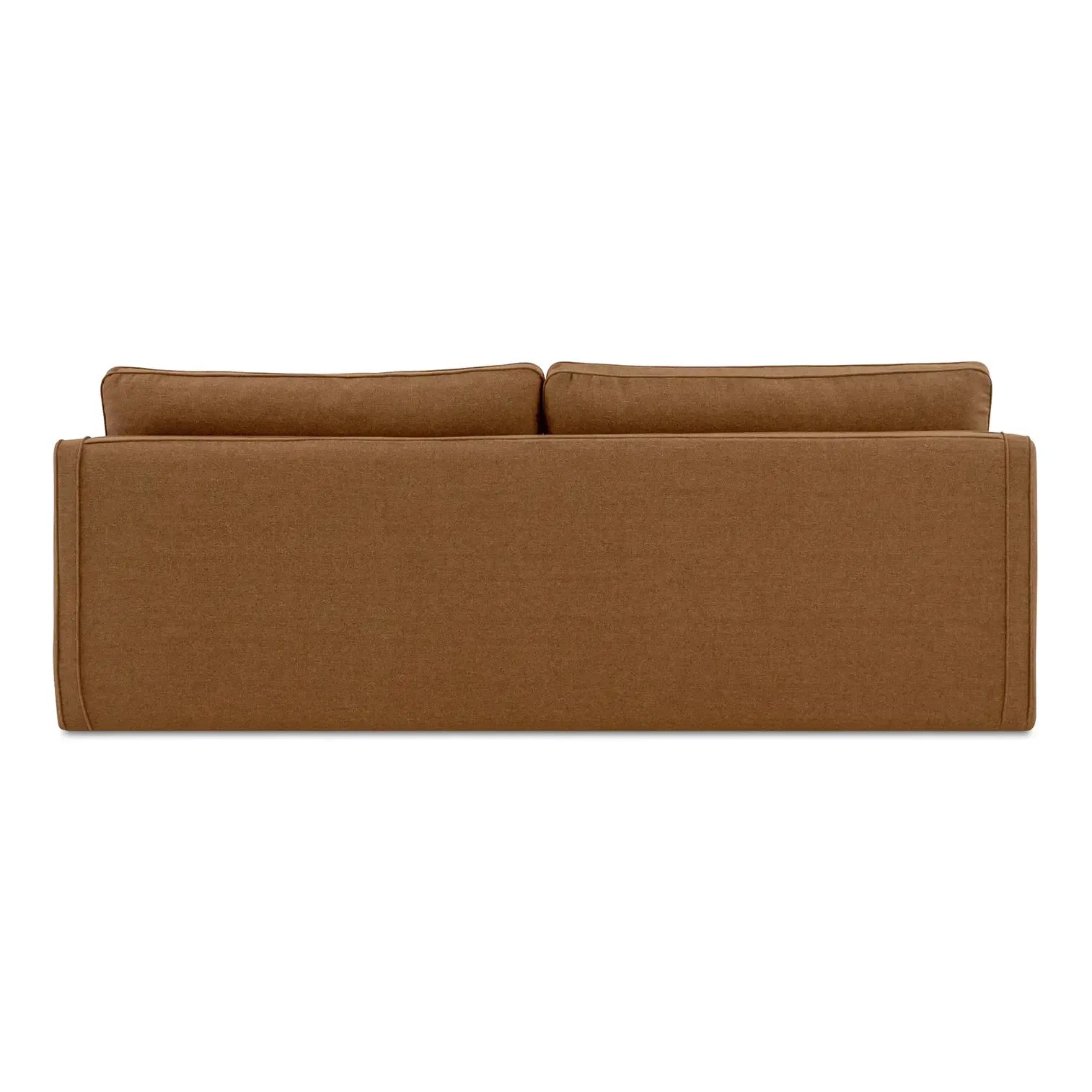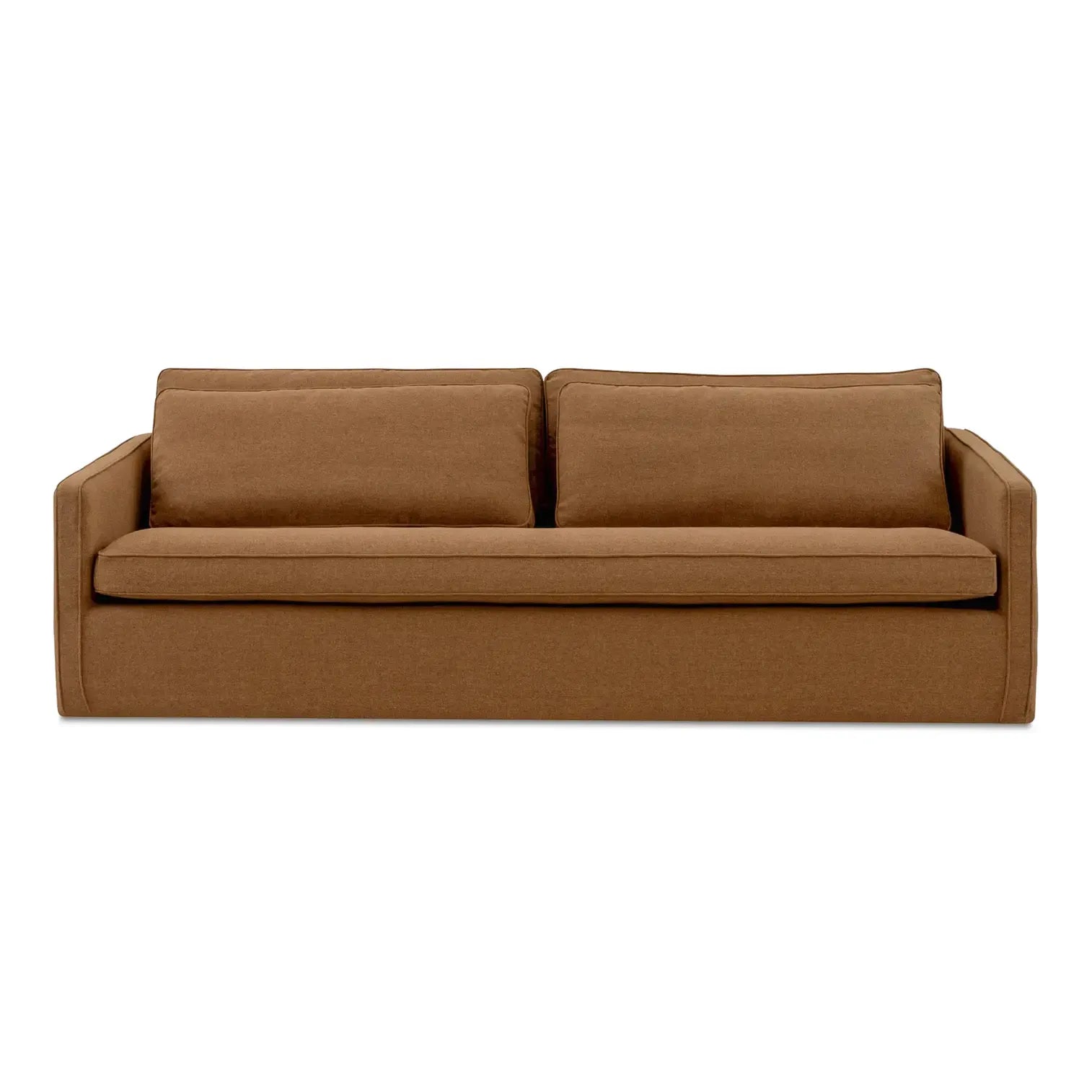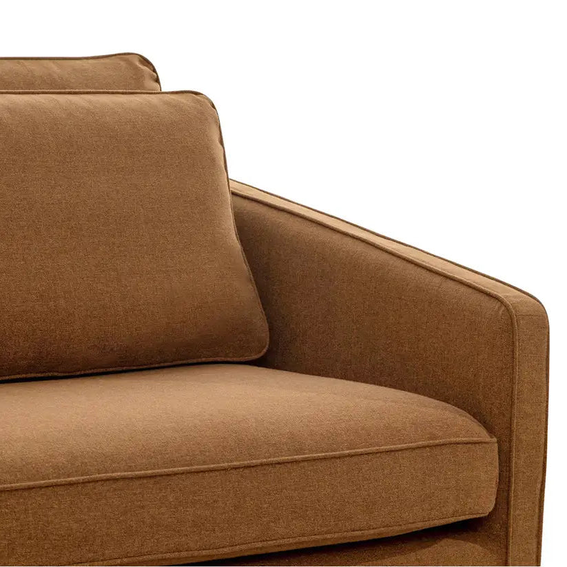 The Phoebe sofa in rust embodies transitional elegance with its minimalist form and tapered arms. The linear form is softened by a plush, feather-topped bench seat. Delicate piping adorns the arms and layered back cushions, adding tailored finesse. Upholstered in a soft, durable C0 performance fabric, it marries style with practicality.
