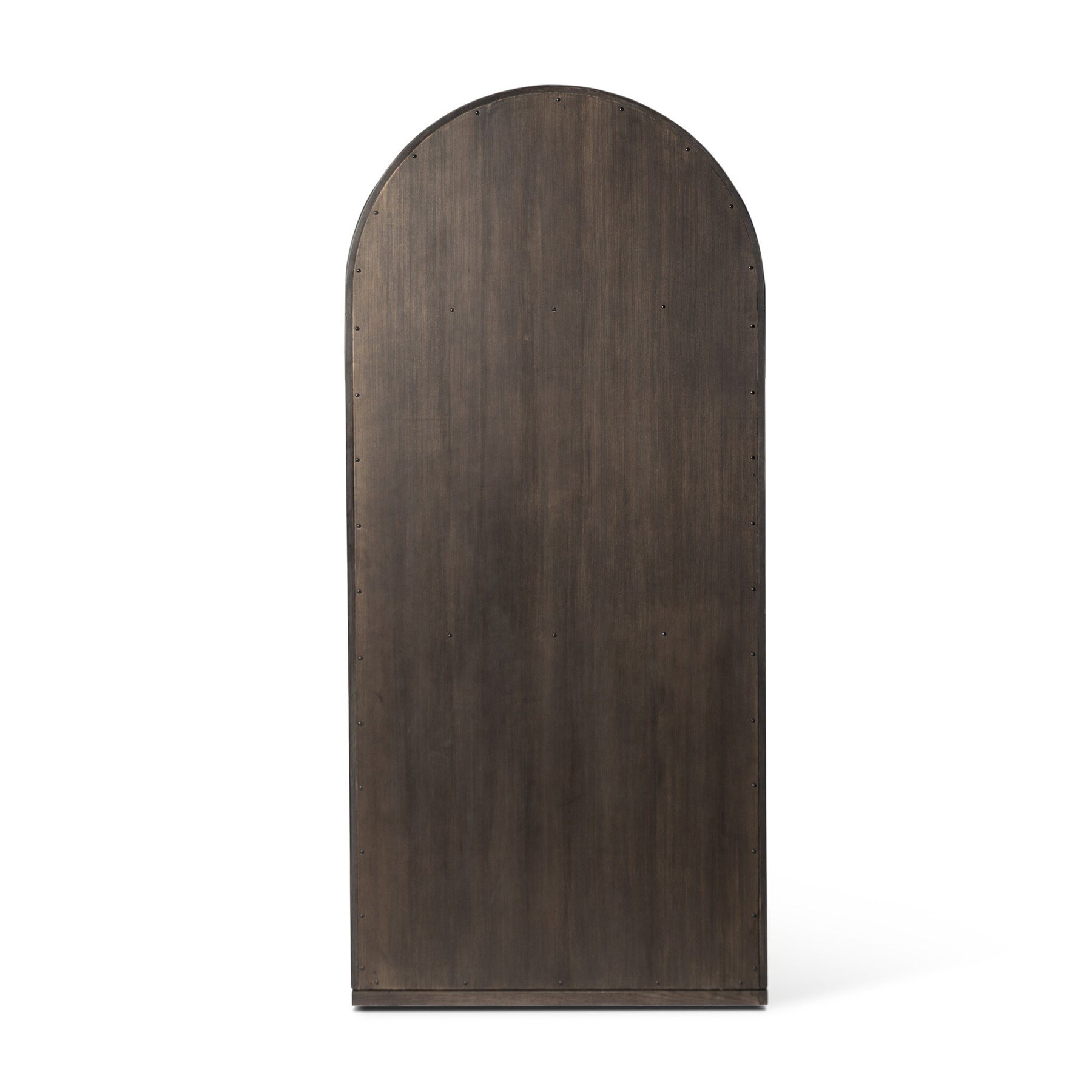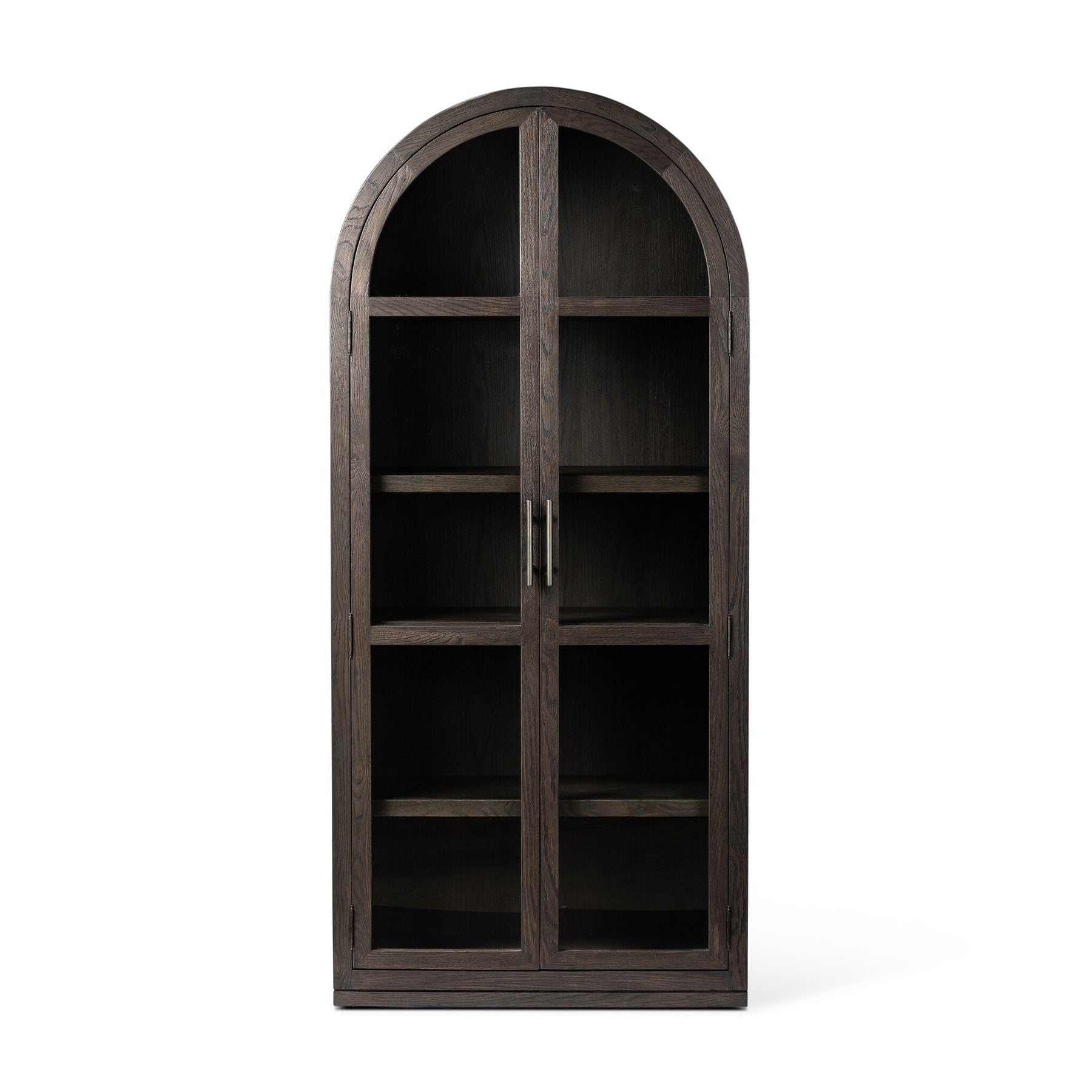 Beautifully arched with a flush plinth base, a versatile oak cabinet features a dark, rich finish. With generous interior shelving, a tempered glass front allows you to showcase favorite books and treasures — letting anyone who enters your space know exactly who you are.