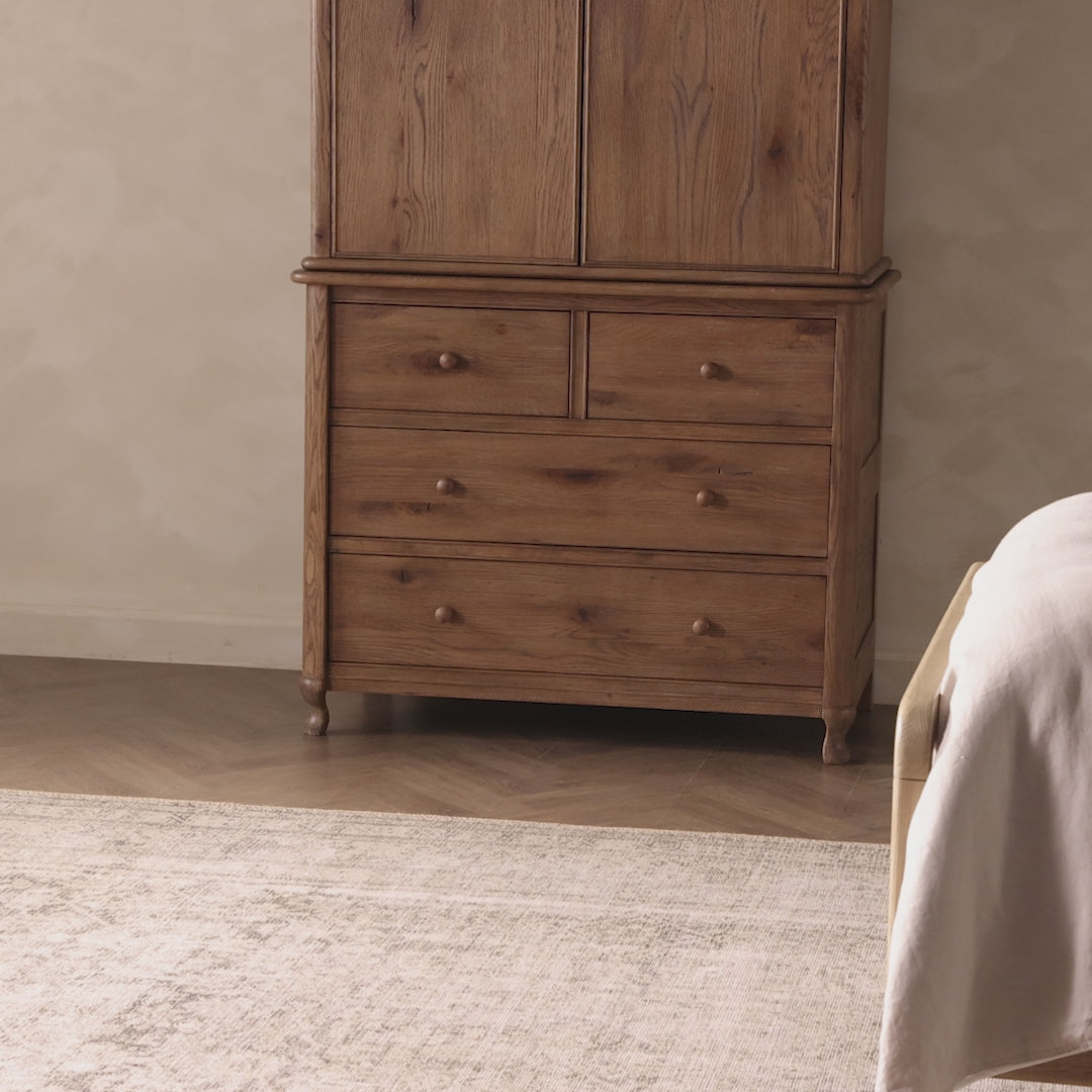 A heritage-inspired armoire stores in timeless style. Built with heavy weathered oak resting on smooth, decorative feet, the front has beading around the drawers and doors for an heirloom appeal. It's finished in a tonal brown, with turned wood hardware, adjustable shelves and a removable bronze rod for hanging garments.