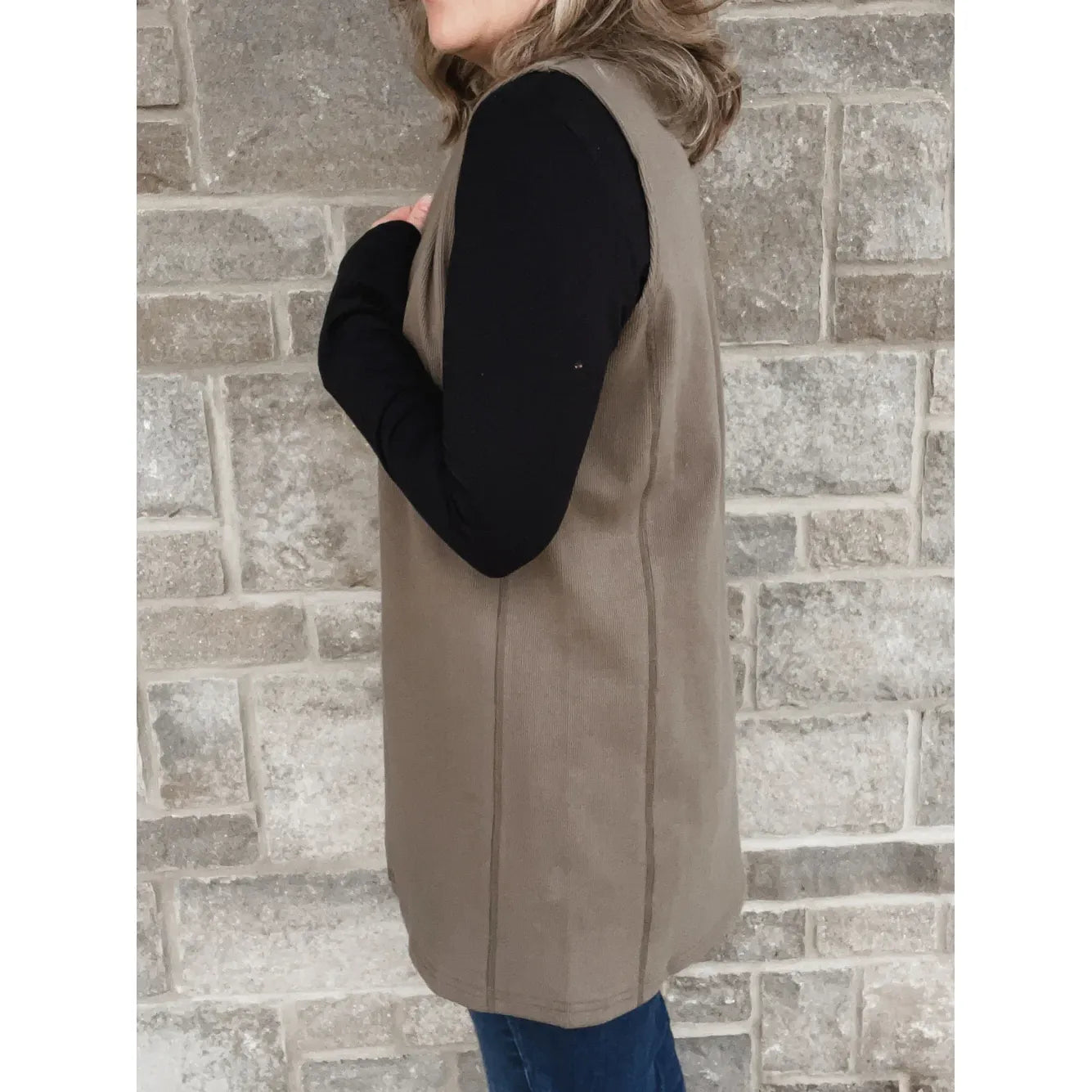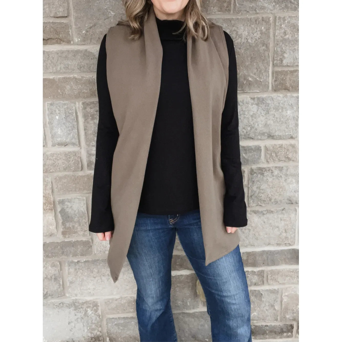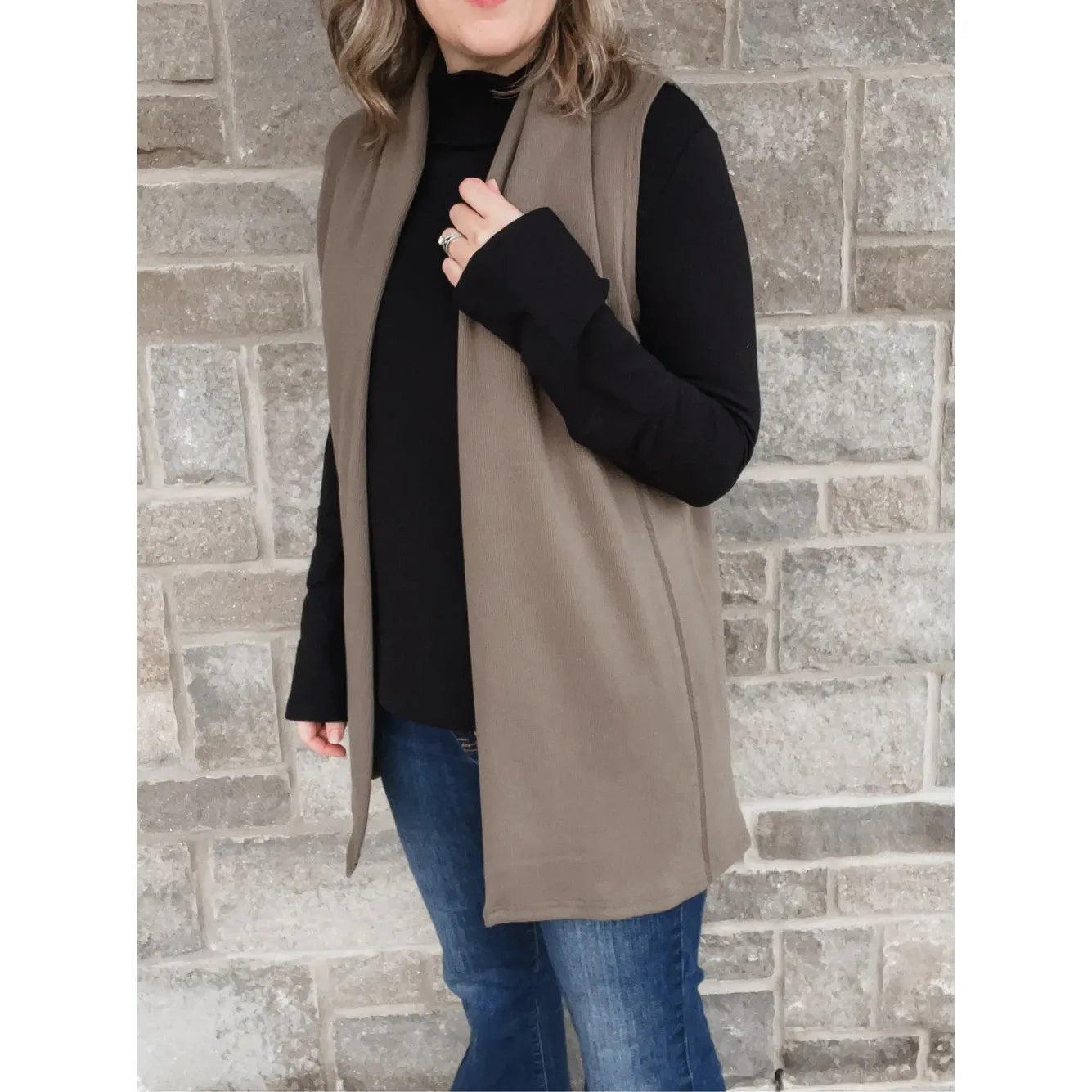 Try the Alpine Vest for an elevated outfit! It is perfectly structured at the neck, has great length, and a textured rib fabric. Layer it with a long sleeve tee or button up shirt. It fits comfortably through the back and open in the front. It's meant to stay open but if you want it to cross a bit more - size up!