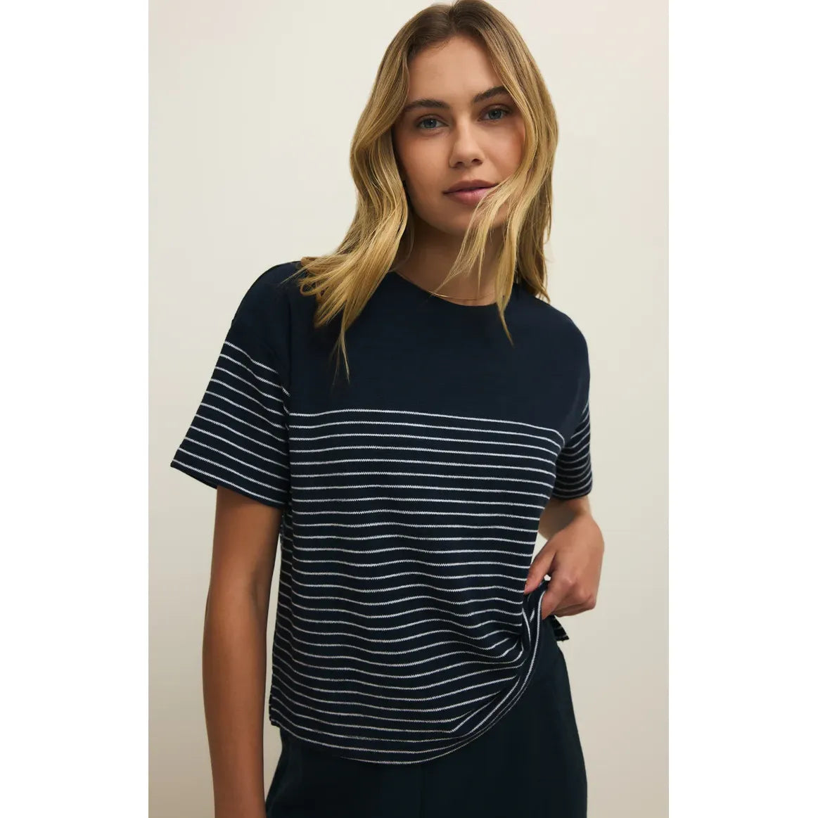 This striped top features a textured knit blend in a relaxed silhouette. Pair with the Andre Wide Leg Pant for your most comfortable outfit yet.
