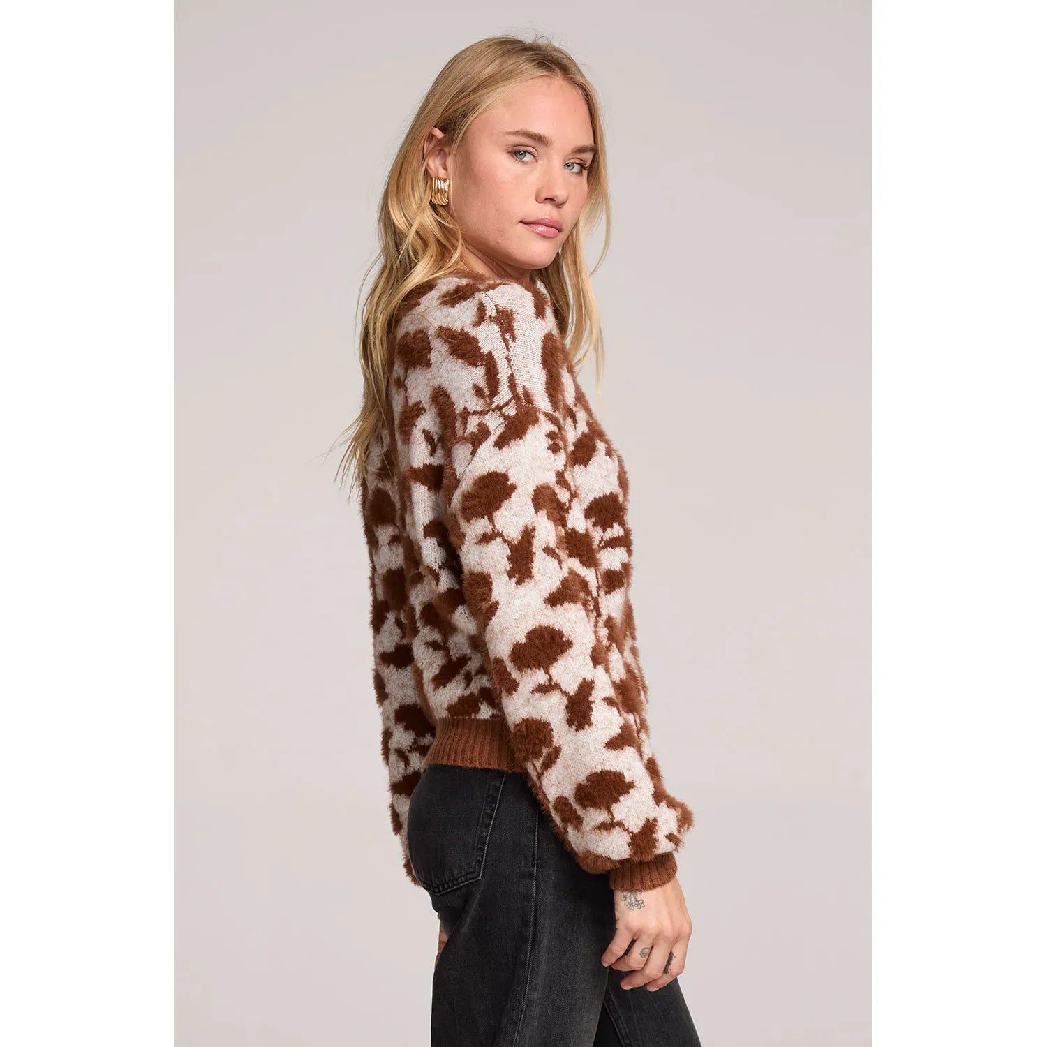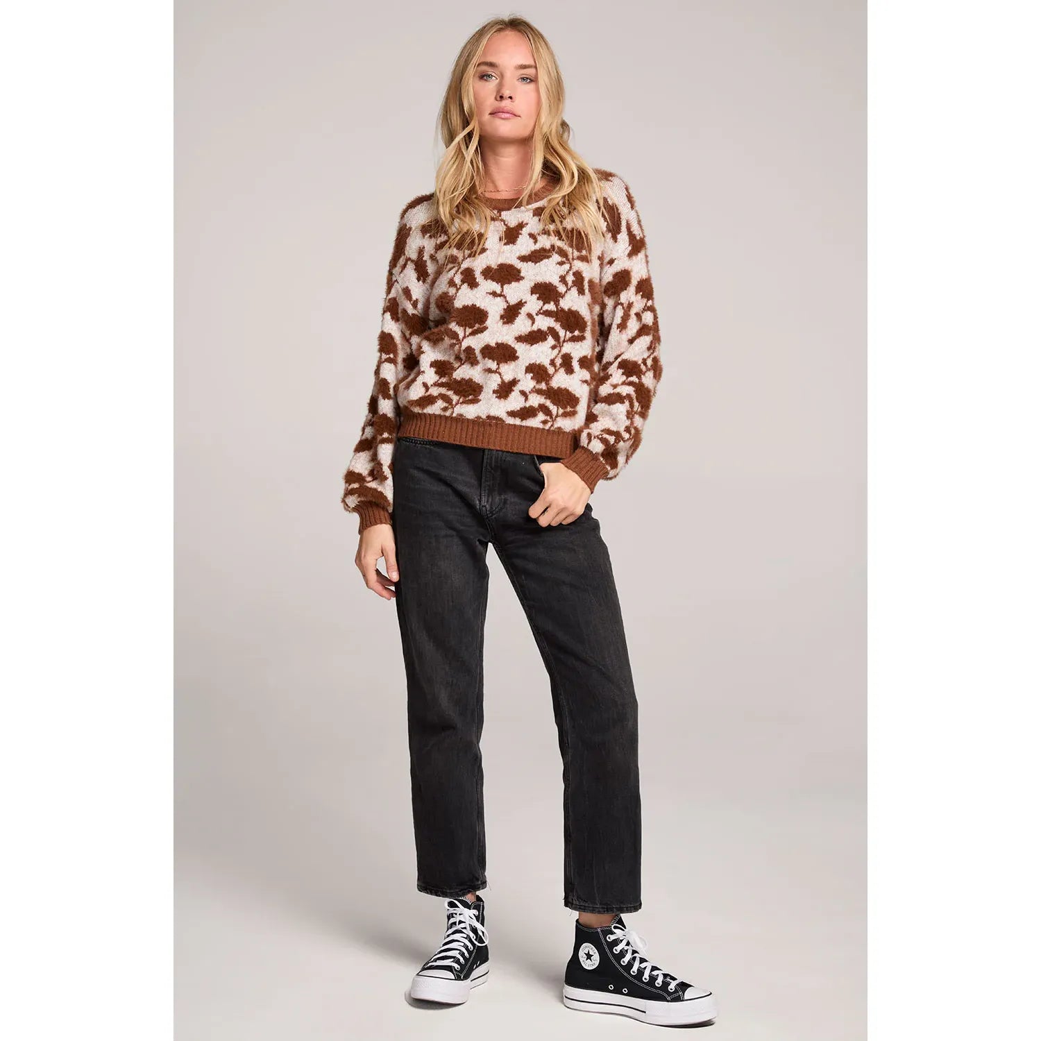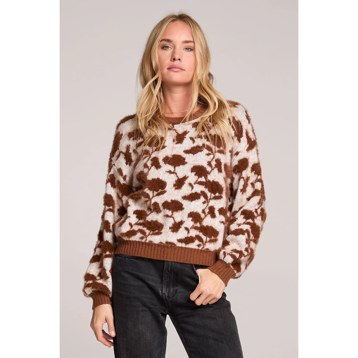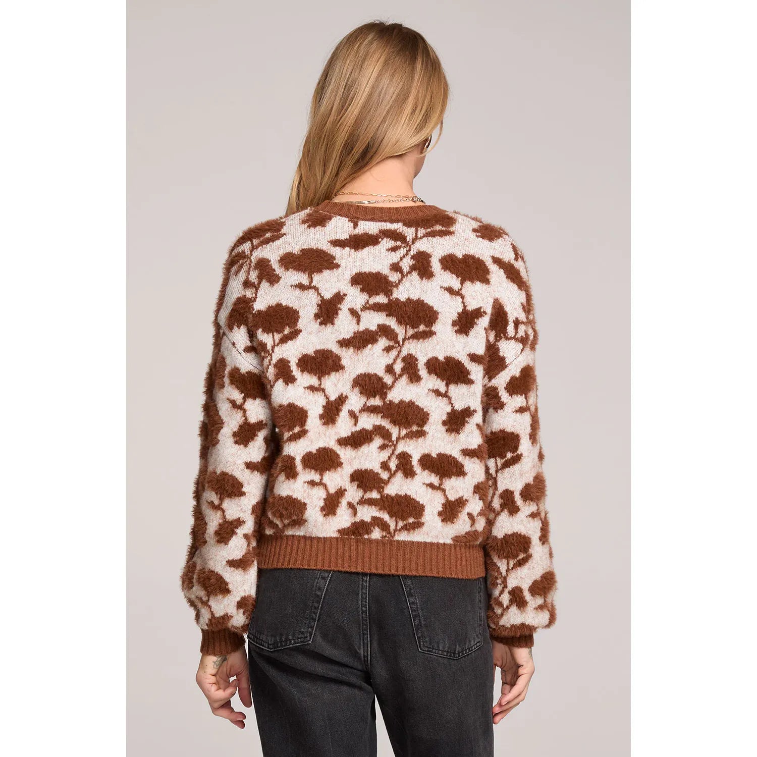 The Mimi Mocha Sweater showcases a blooming floral motif with oversized sleeves gathered at the wrist.