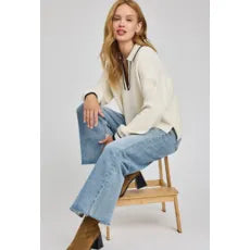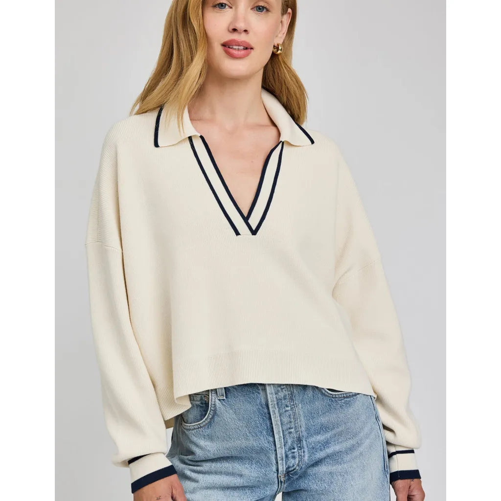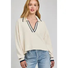 The Tristan sweater is made of a soft yarn in a half cardigan stitch. Features include a collar with v-neckline and contrast stripe color details
