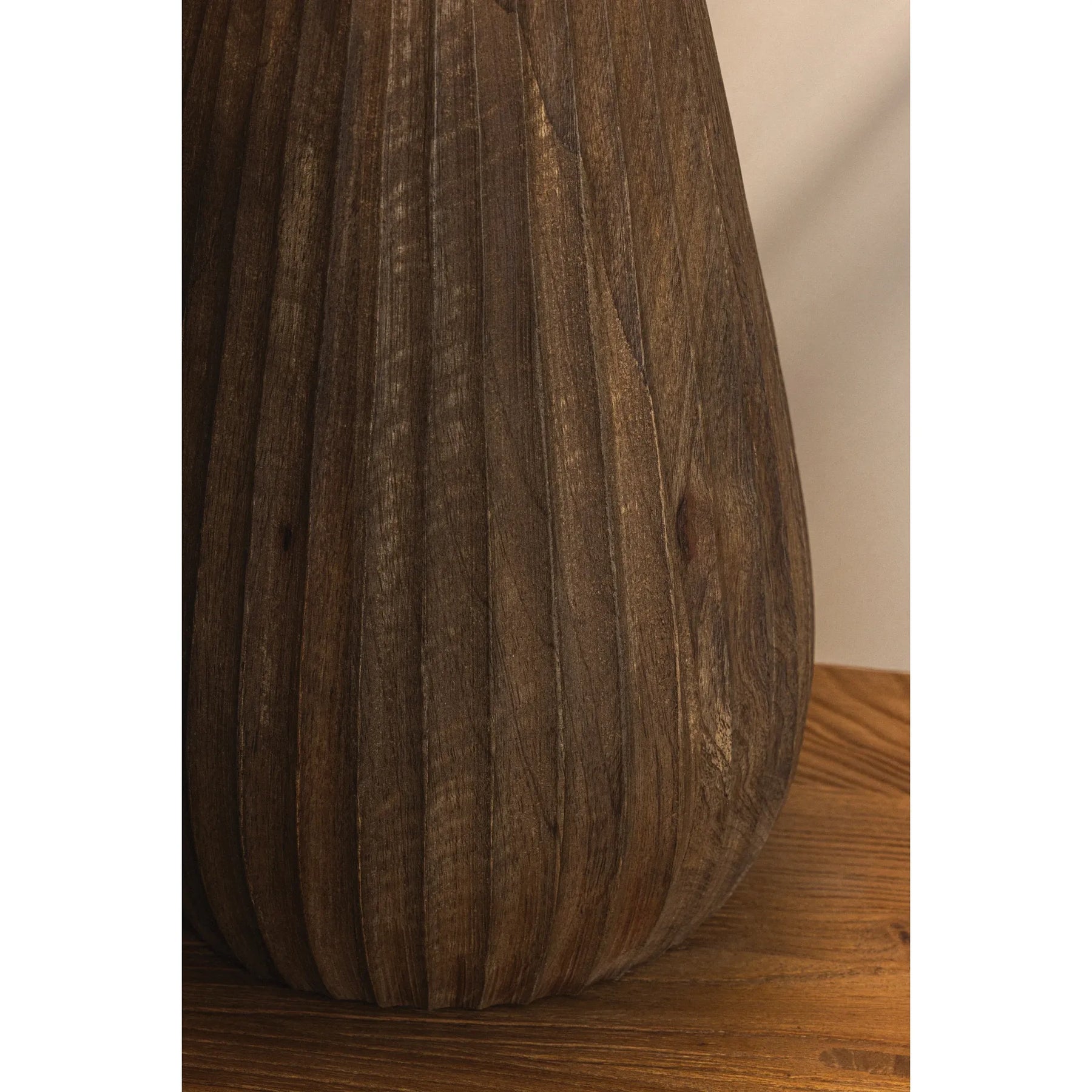 With its hand-carved base and warm stained wood, Heartwood is a sculptural study in texture and authentic charm. Rustic grooves add depth and character, while an ivory linen shade softens the silhouette. A Patina Brass neck lends a hint of polish to this grounded, one-of-a-kind design.