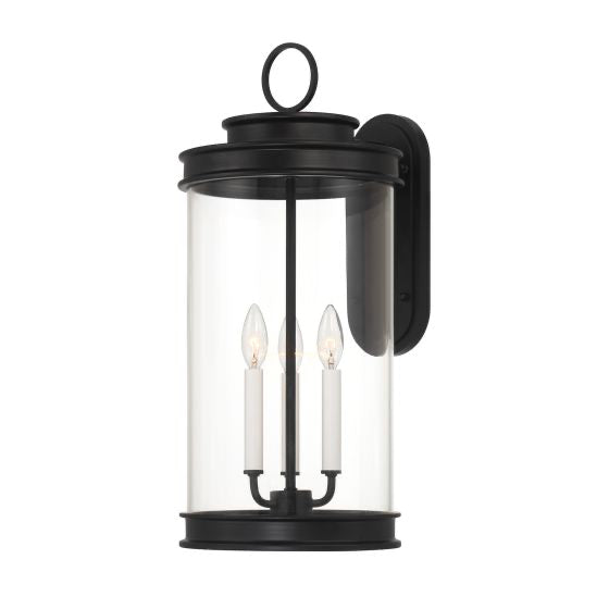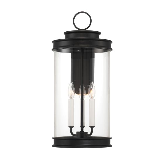 Classic lantern style gets a fresh new look in the Savoy House Englewood 3-light outdoor wall light. A beautiful cylinder of clear glass is held in a minimally detailed frame finished in timeless Matte Black. White candle covers create a perfect pairing with the finish. Englewood is 23.5" in height, 10.5" in width and extends 13" from the wall. Uses three candelabra size bulbs of up to 40 watts per bulb. Bulbs not included. Wet area rated.