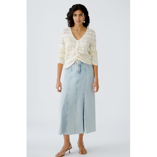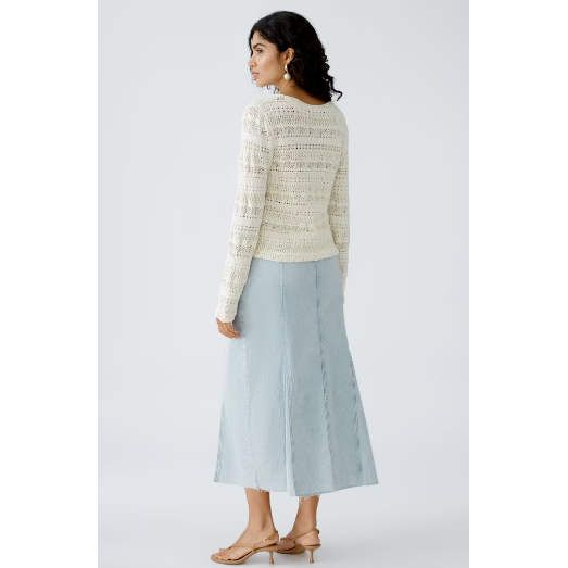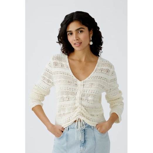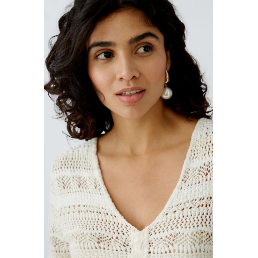 Pullover knitted using an elaborate warp technique, resulting in the trendy, transparent macramé look
