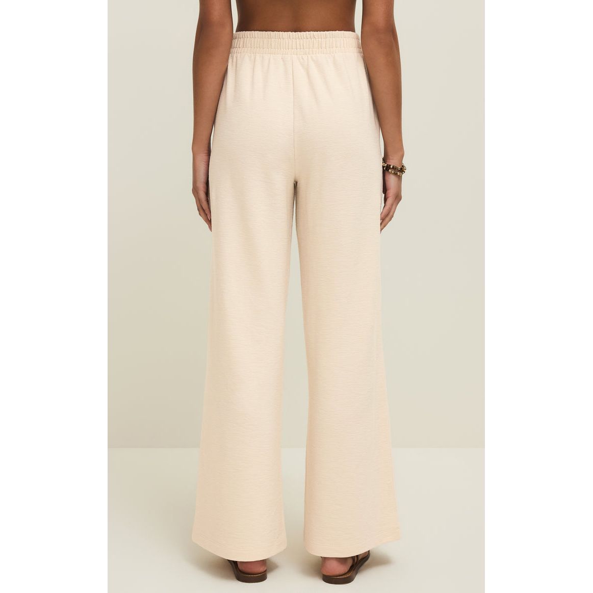 Comfort is key with this wide leg pant featuring a soft textured knit. Featuring an elastic waistband, high rise fit, and side pockets, this lightweight pant moves gracefully with you.