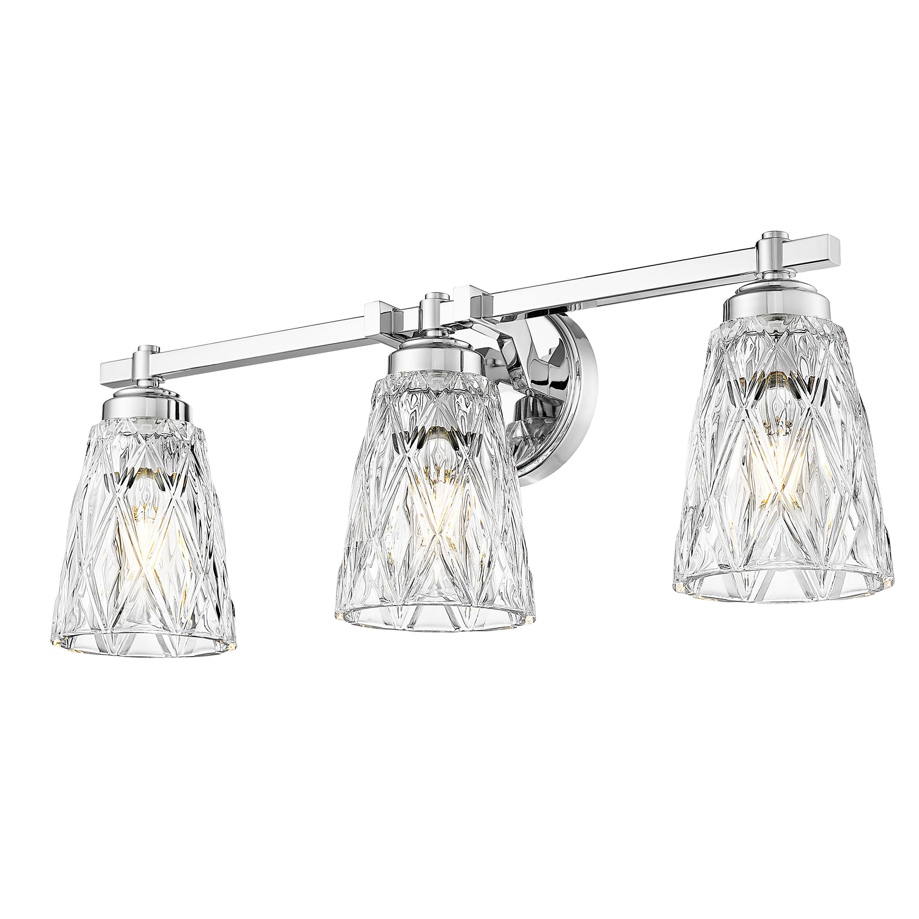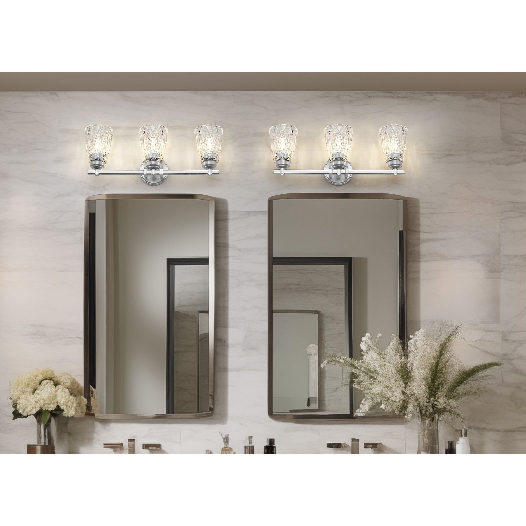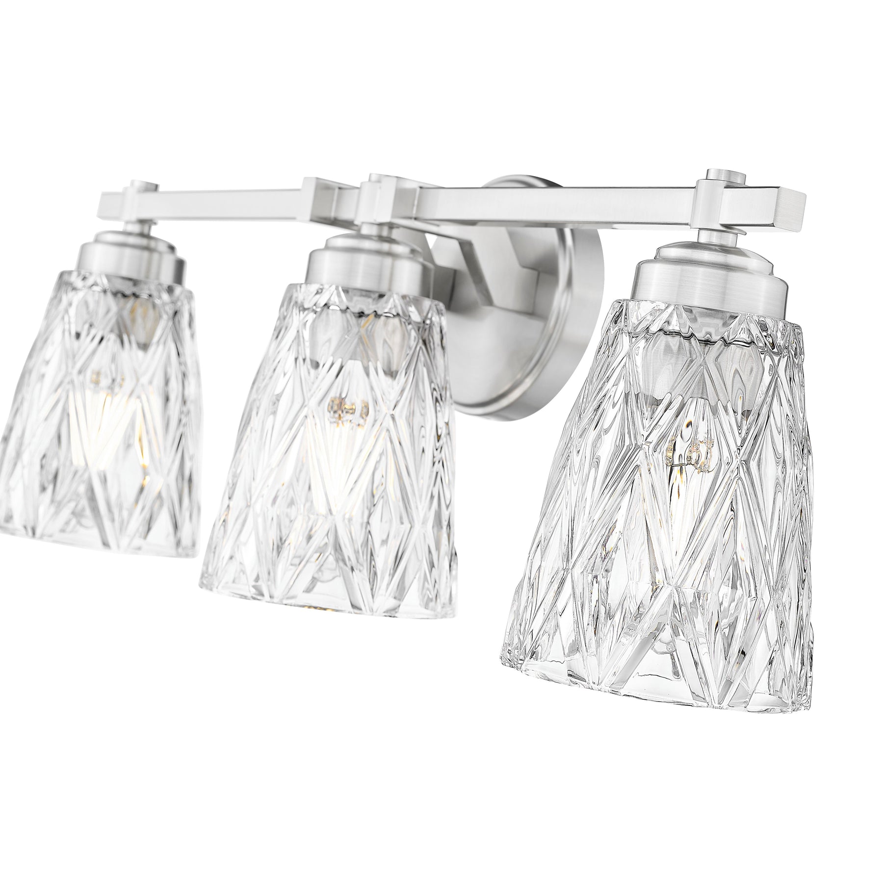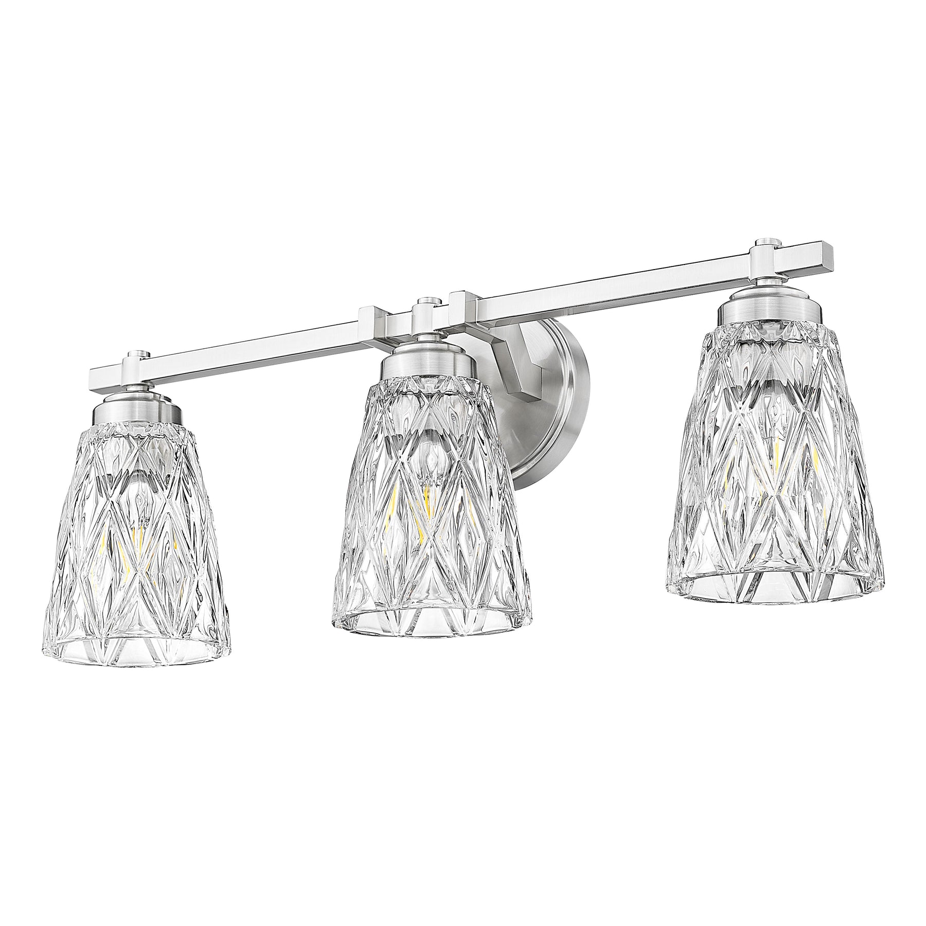 With its overlapping diamond pattern on the glass shades that reduces glare, the Andree vanity series is an elegant choice for any bath. It is offered in 1-, 2-, 3-, 4- and 5-light versions with a finish choice of Brushed Nickel, Matte Black, Chrome, and Modern Gold.