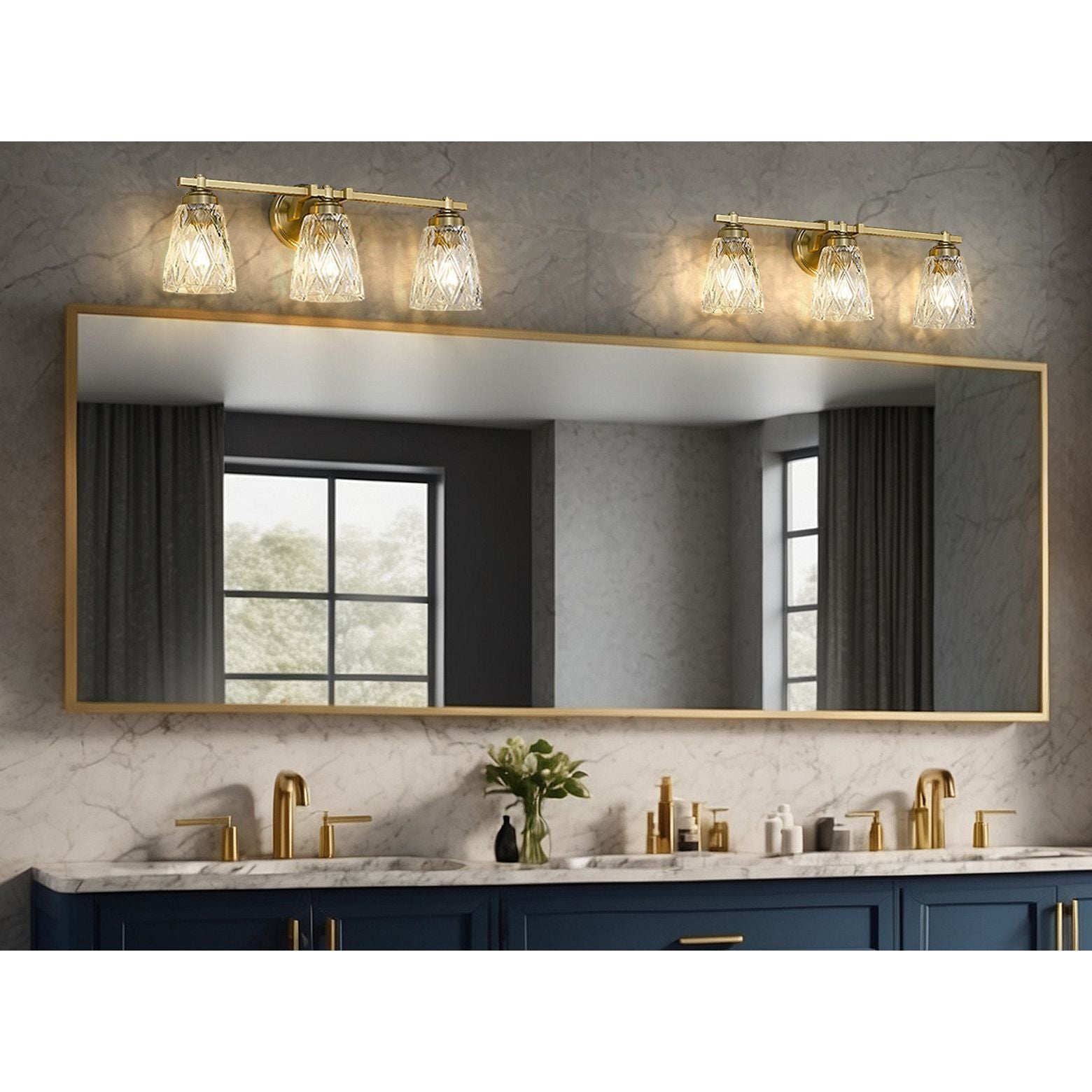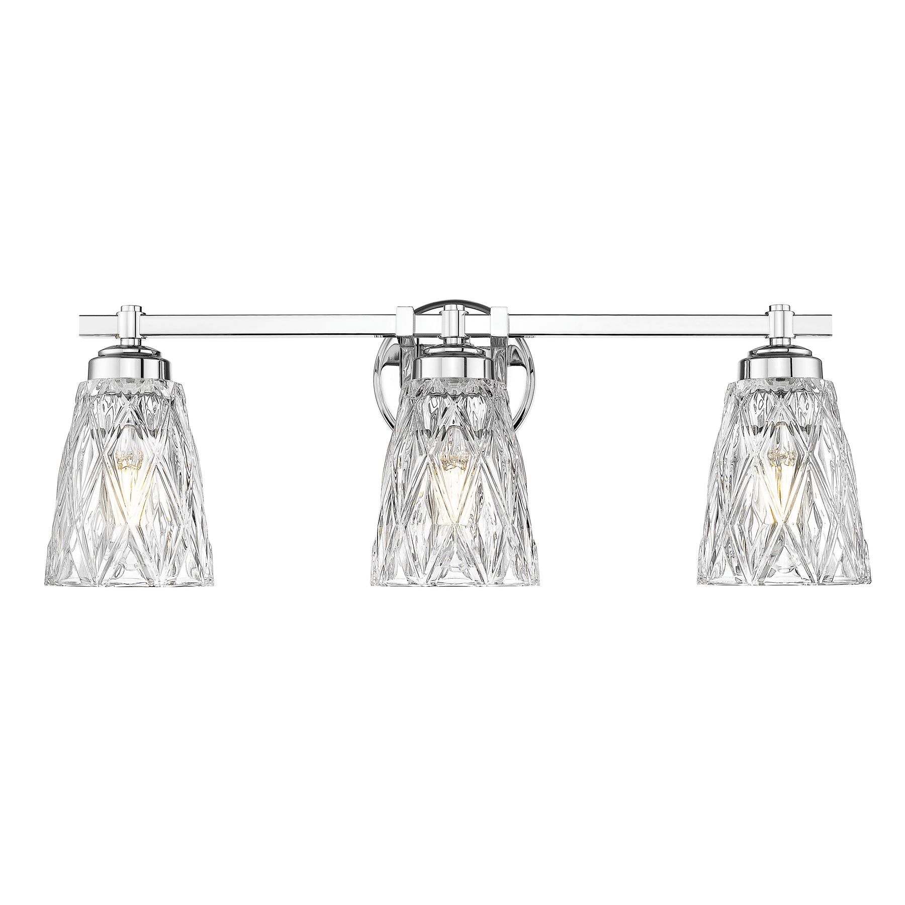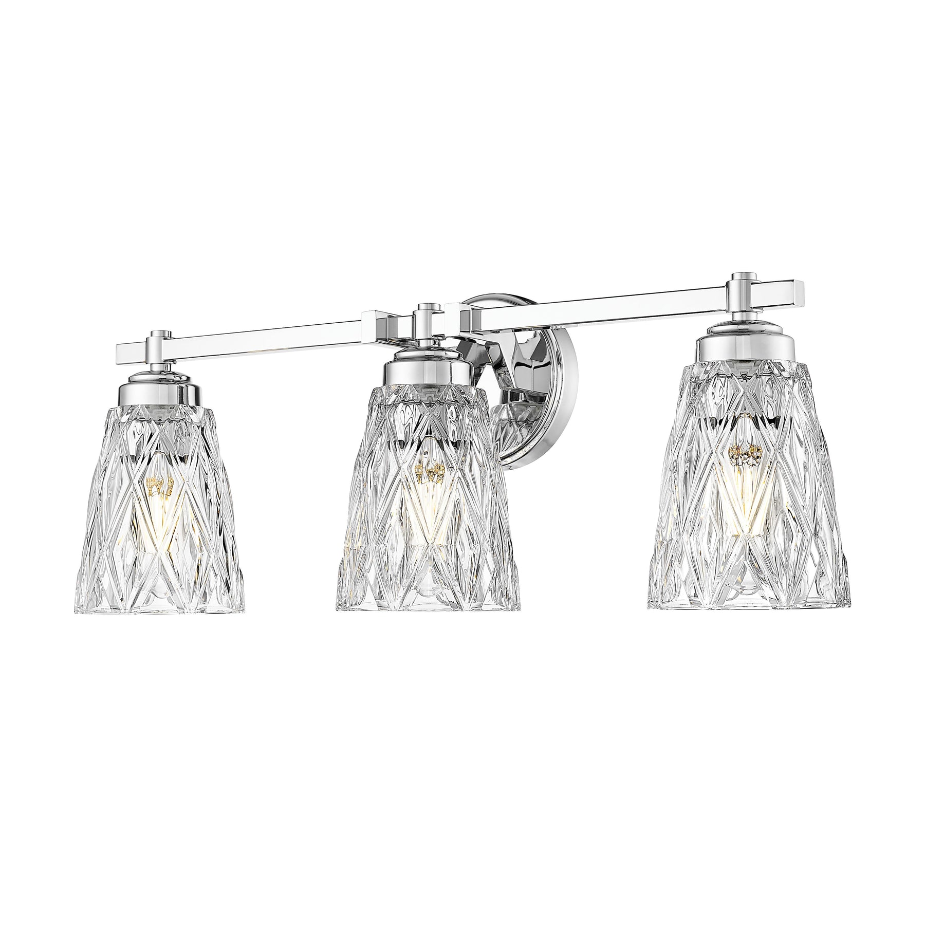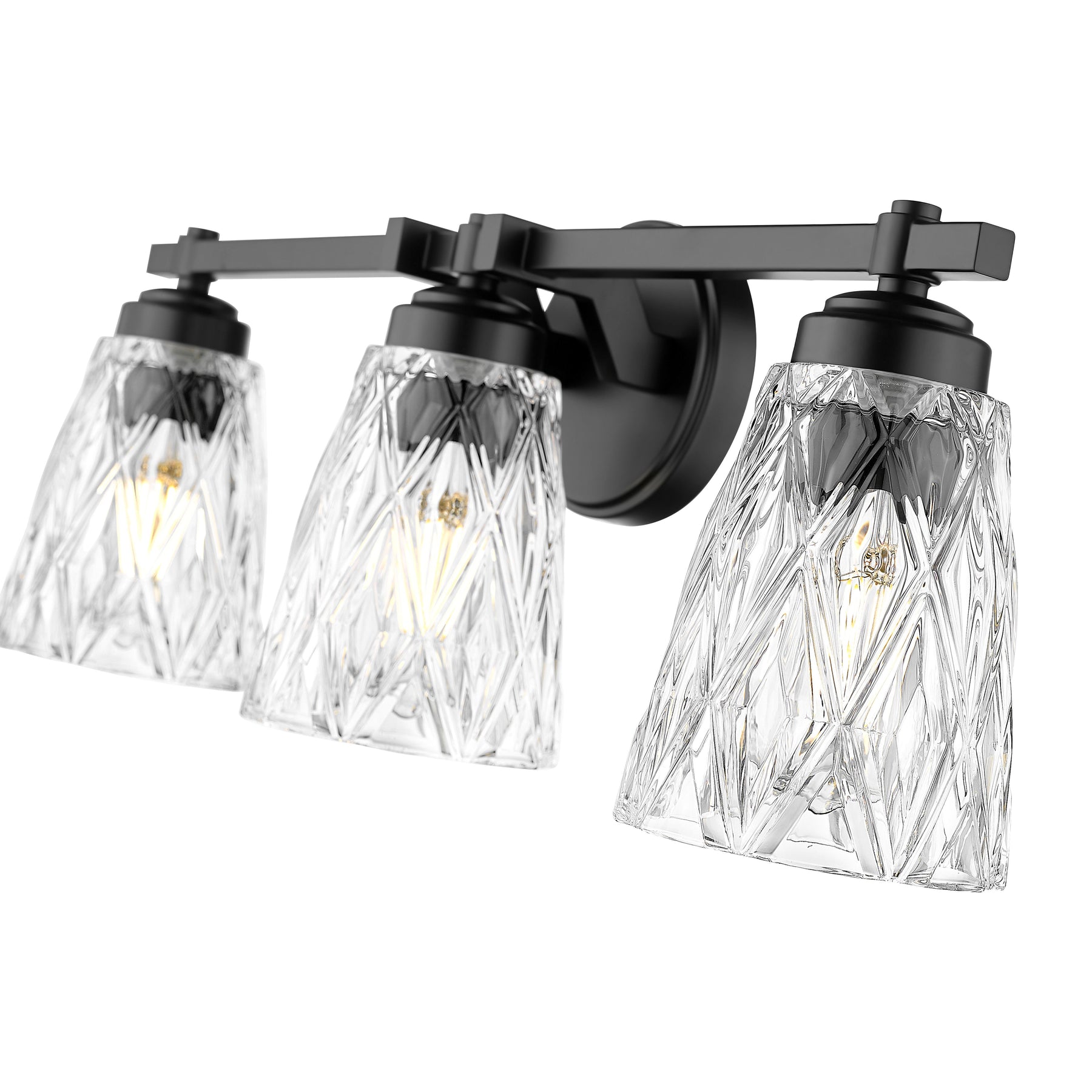 With its overlapping diamond pattern on the glass shades that reduces glare, the Andree vanity series is an elegant choice for any bath. It is offered in 1-, 2-, 3-, 4- and 5-light versions with a finish choice of Brushed Nickel, Matte Black, Chrome, and Modern Gold.