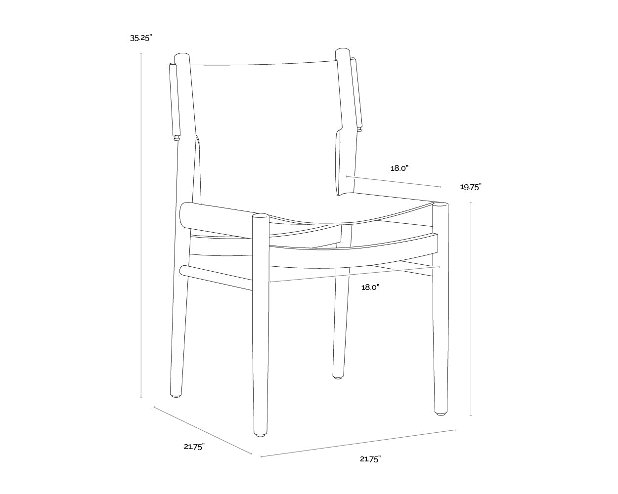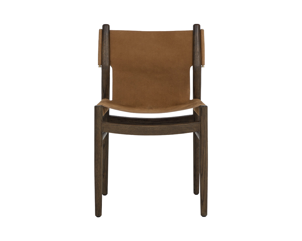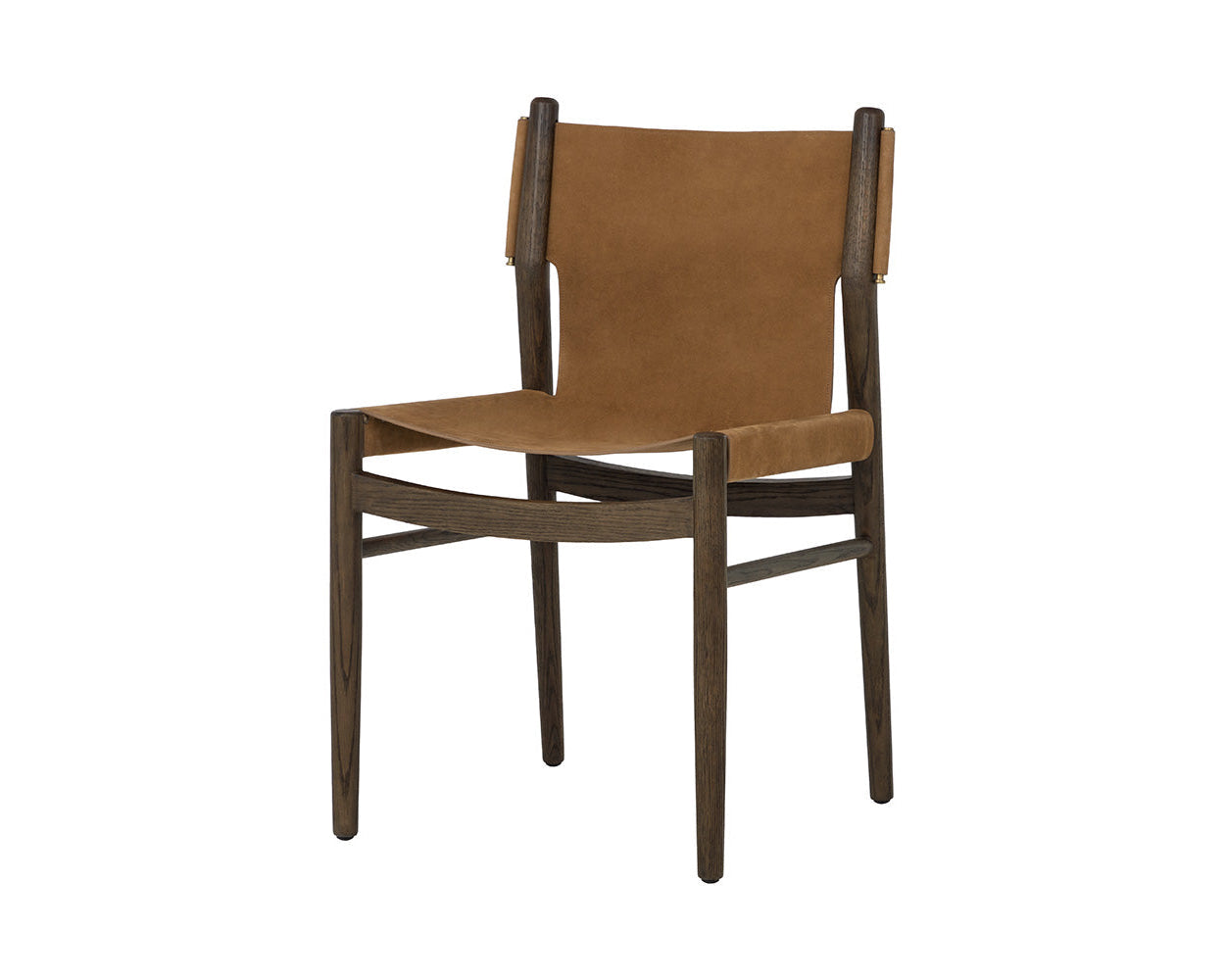 Crafted from a single piece of supple nubuck leather, the seat and back of the Argus Dining Chair are elegantly suspended within a solid oak frame. Inspired by the relaxed form of a director's chair, it features stitched leather side panels highlighting its artisanal finish. With its clean profile and sling-style silhouette, it channels a refined mid century-modern aesthetic.