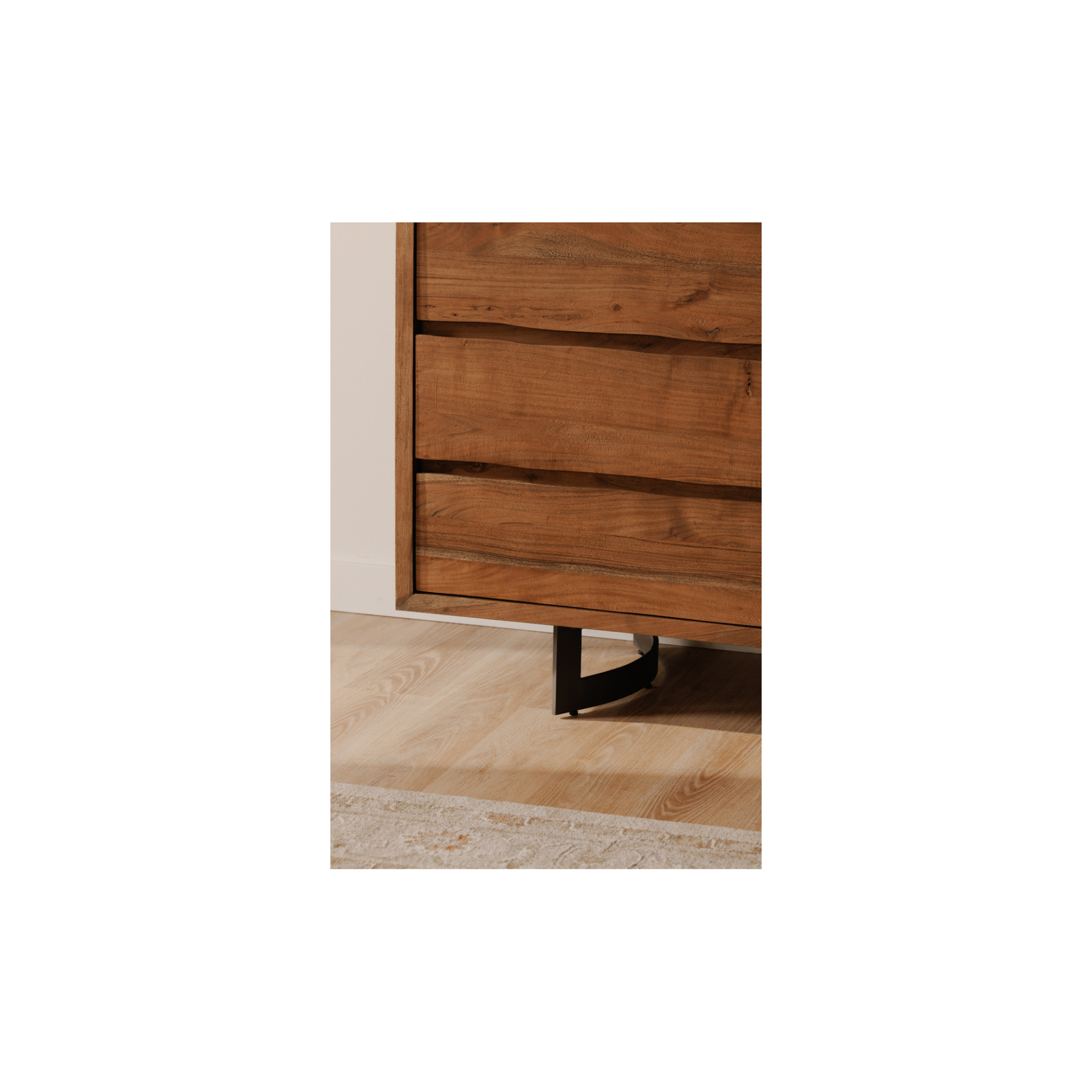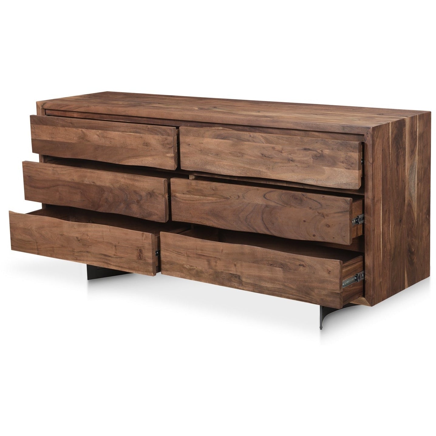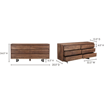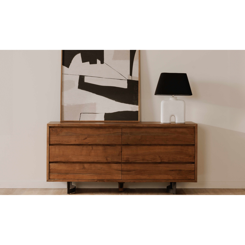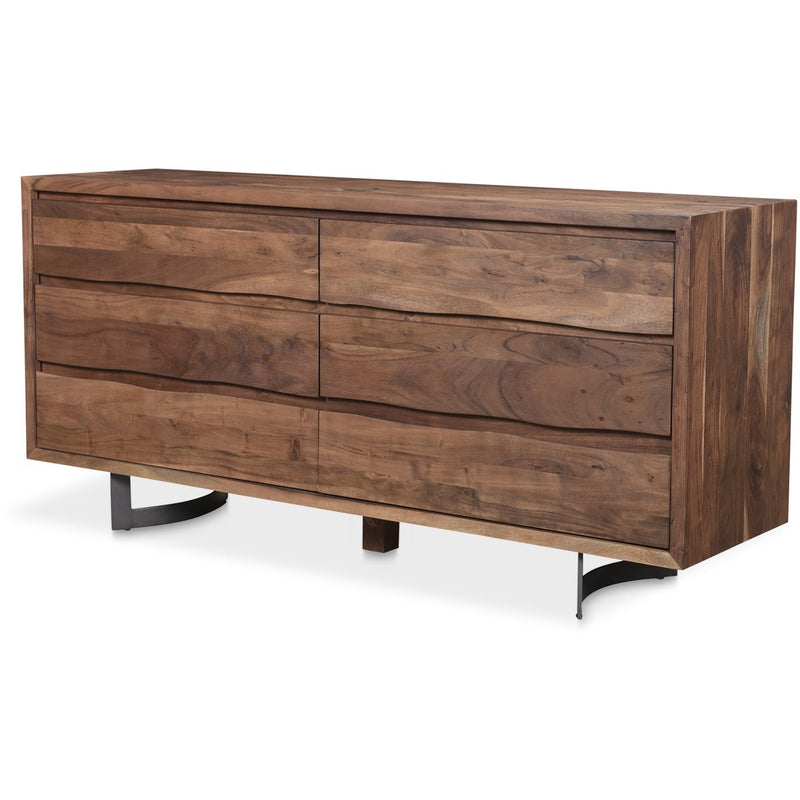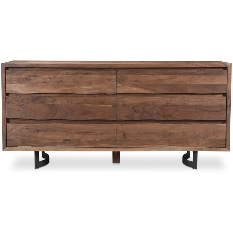 The Bent collection puts nature’s craft front and center. Made of beautiful solid acacia wood, rustic live edge detailing shows off the unique knots and whorls of the wood. This dresser features 6 wide drawers on easy slide glides, offering a convenient storage solution for your bedroom space. Pair with other pieces in the Becket bedroom collection for a complete look.