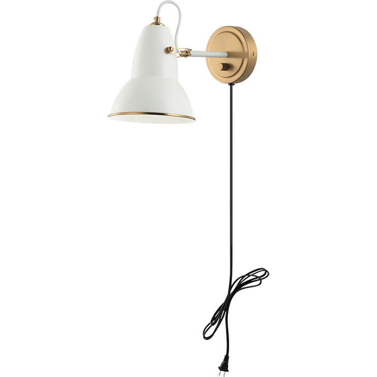 A playful yet sophisticated wall sconce collection. Designed with a dome shaped adjustable shade with Aged Gold Brass trim. This is extended with an adjustable arm. Features a built in dimmer, and available in 2 finish combinations and 2 sizes.