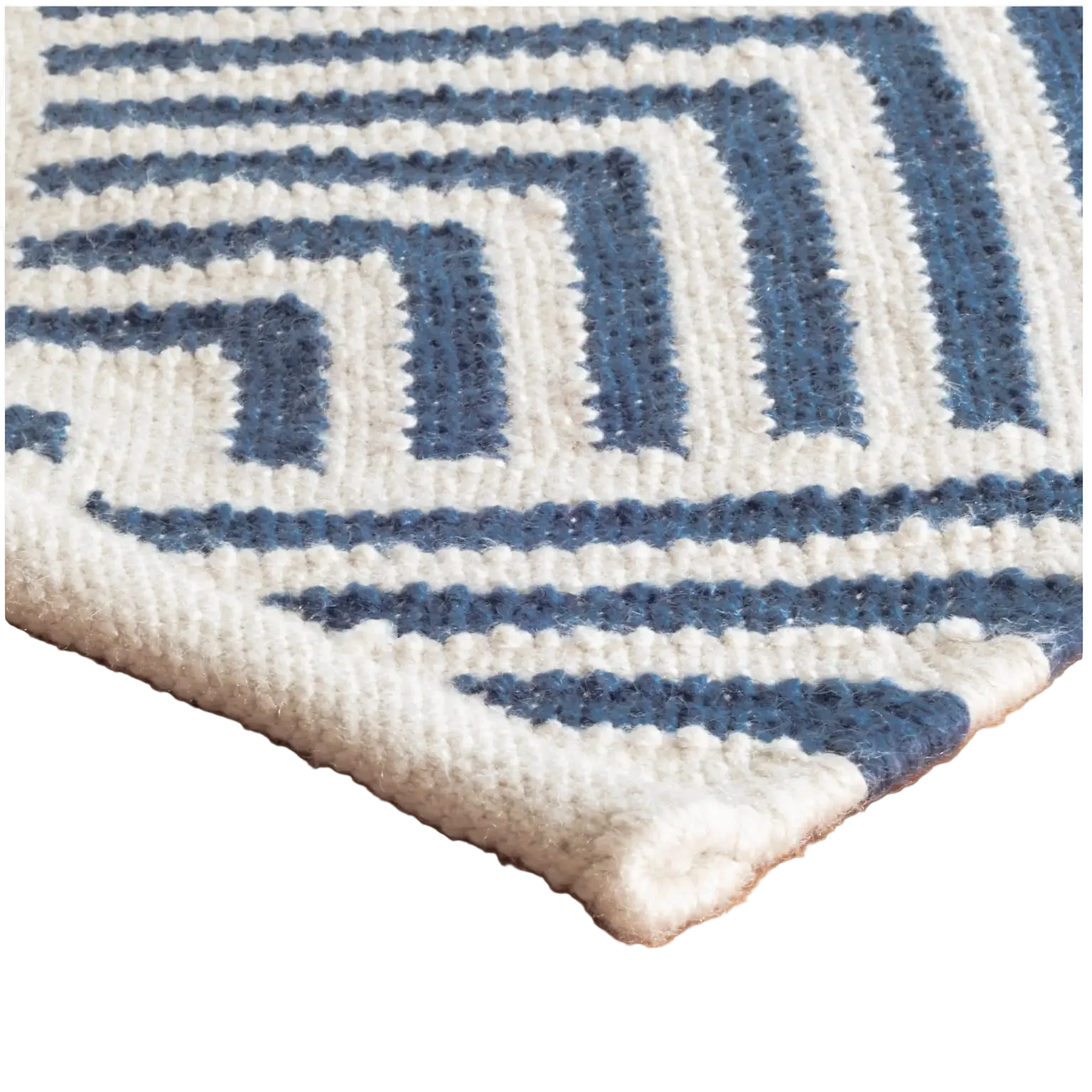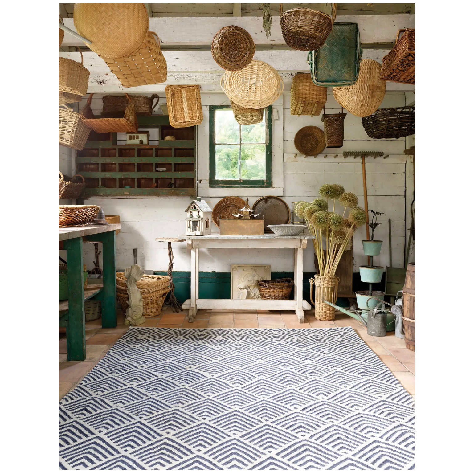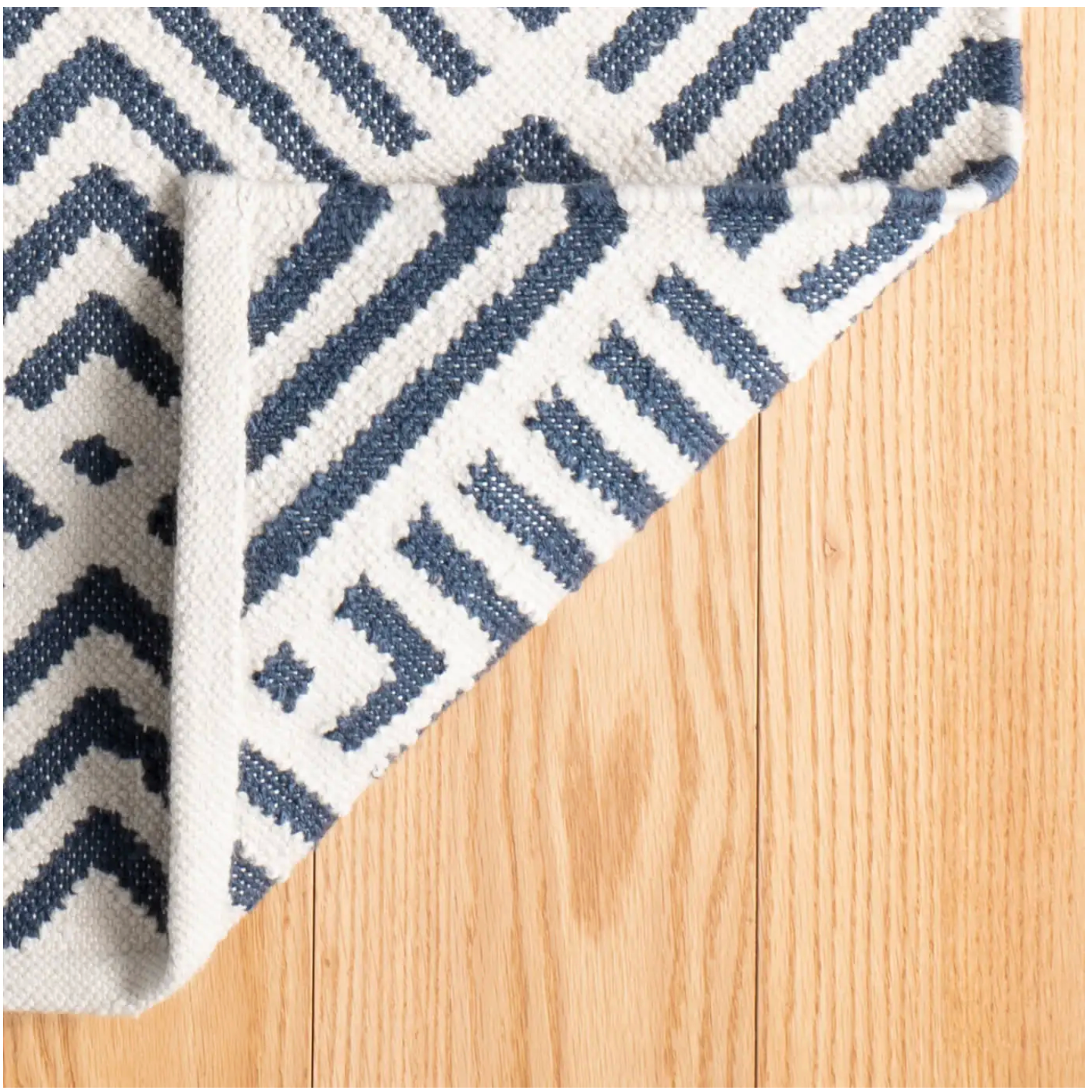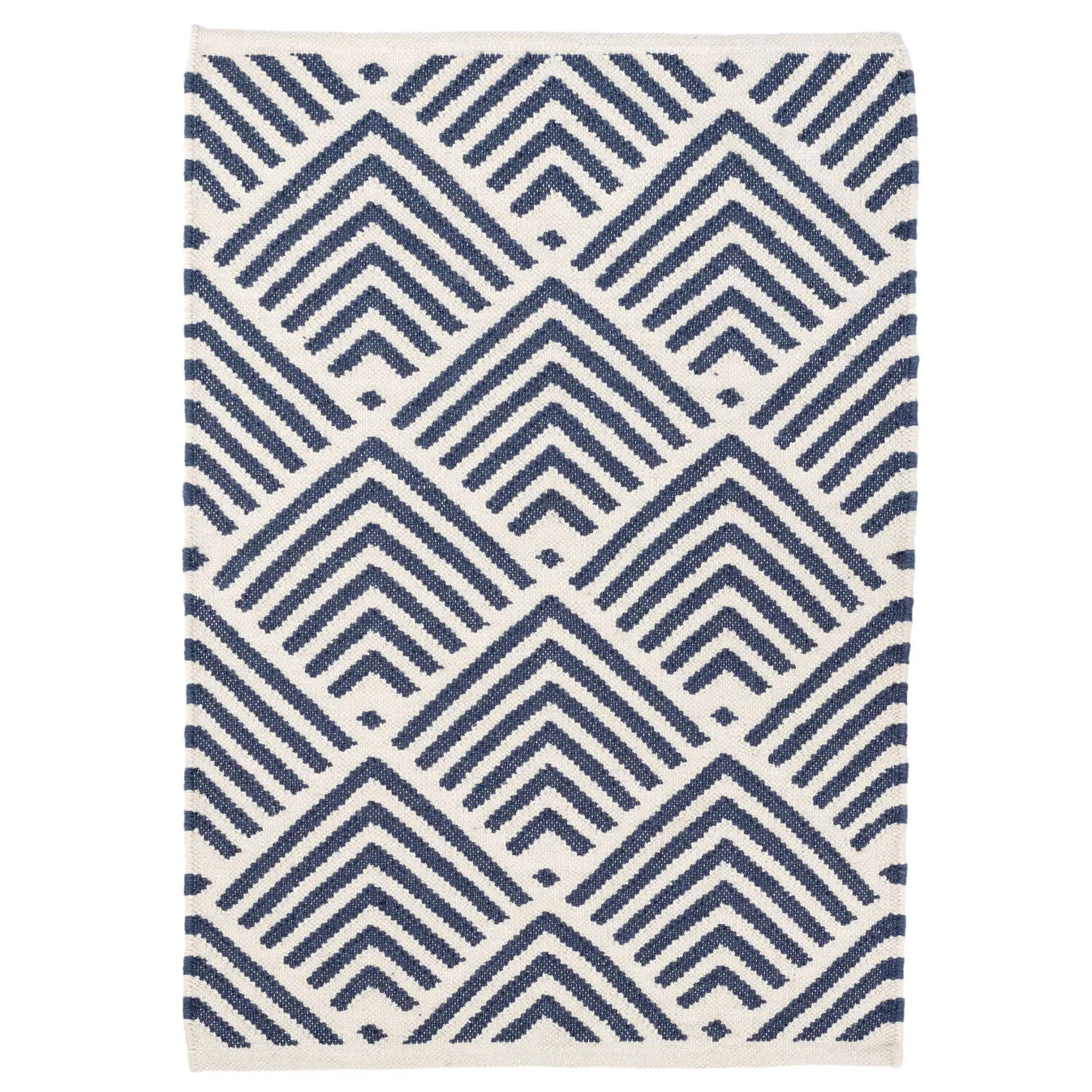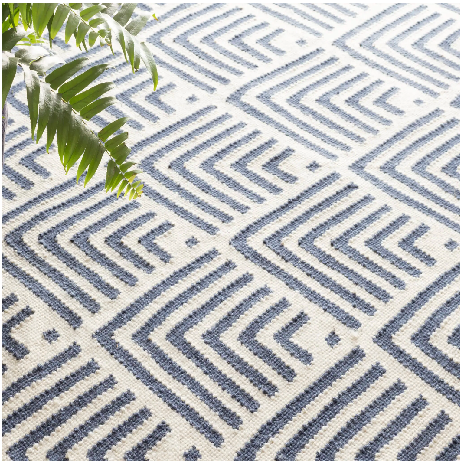 A traditional kilim weave gets the indoor/outdoor treatment in eco-friendly recycled materials and a woof-worthy graphic pattern in classic ivory and blue. Variations in colour are expected.