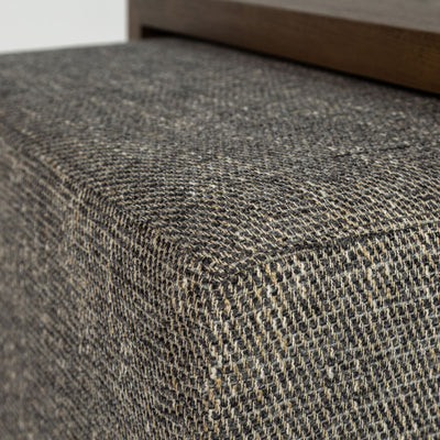 This minimalist ottoman and coffee table combo has hints of Art Deco design and re-imagined with modern styling. Upholstered in a gorgeous fabric, this rectangular ottoman comes with a solid oak waterfall table that slides over the top. Versatile and designed with contemporary appeal, this flexible piece can be used as extra seating, a coffee table or even at the end of a bed.