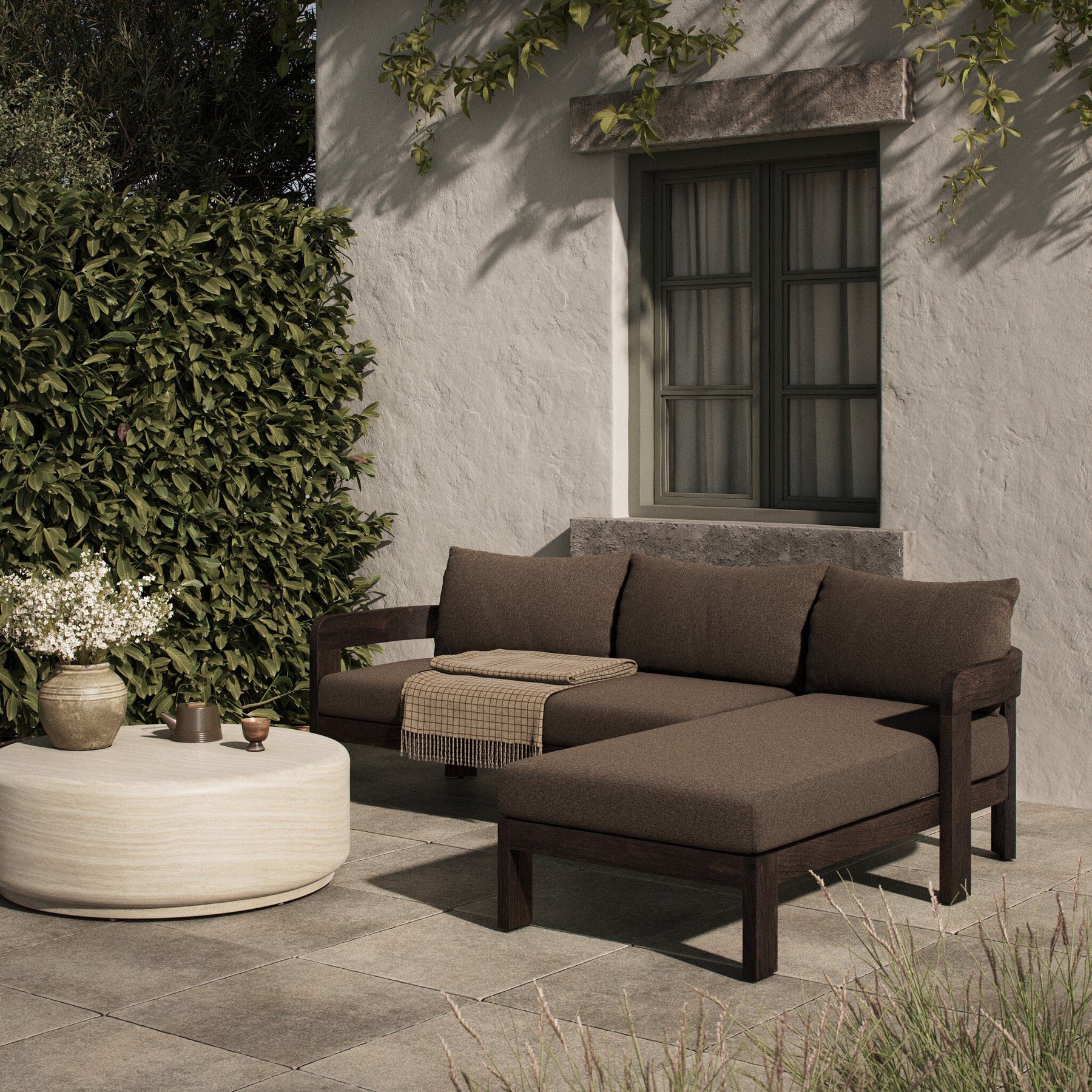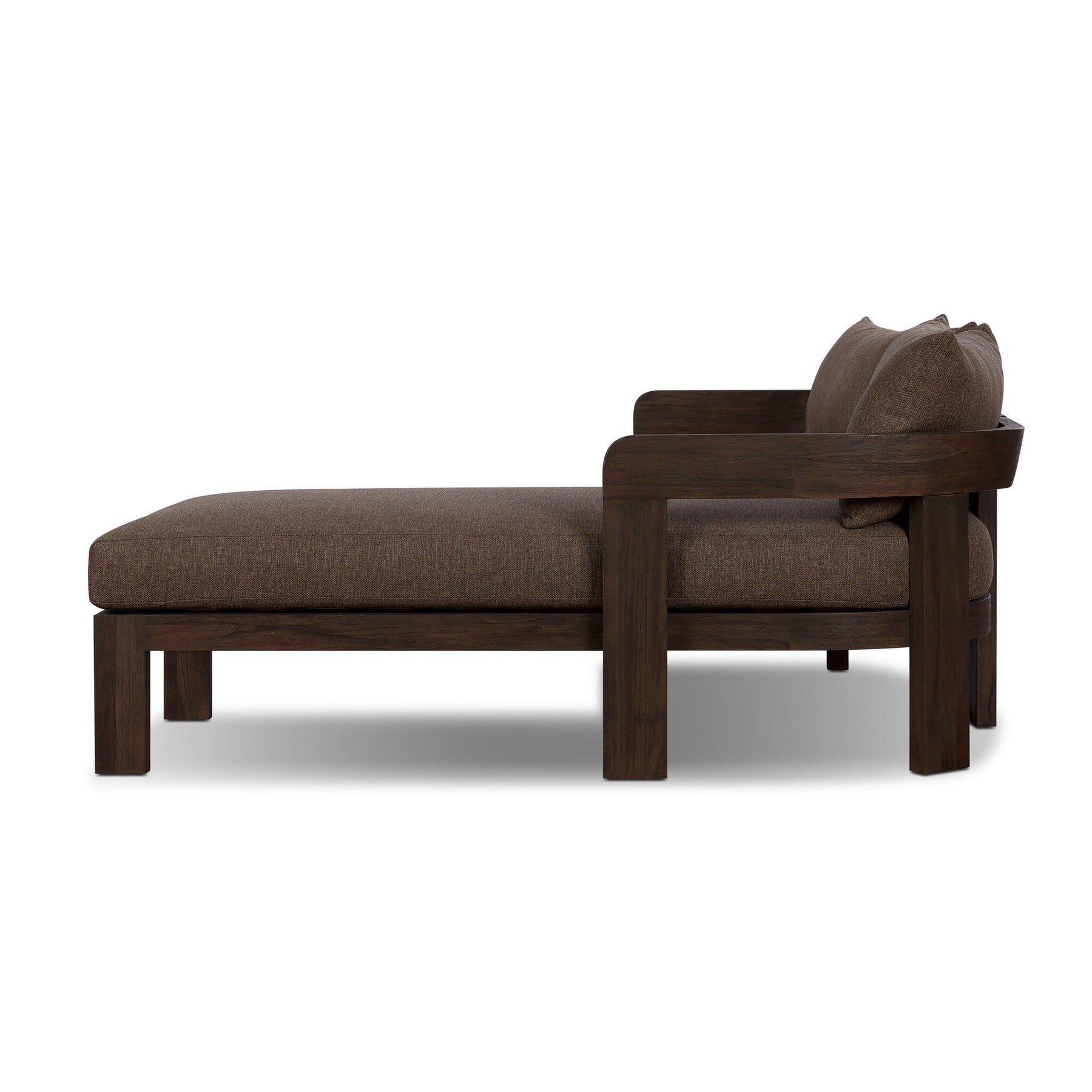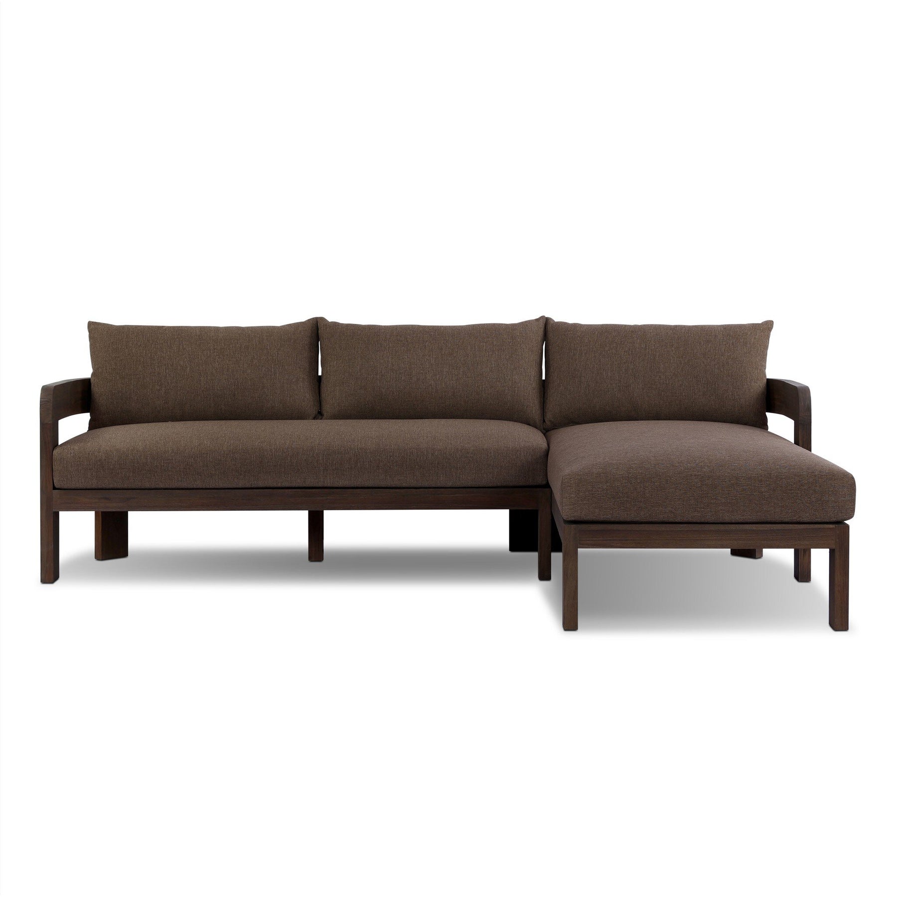 Rich brown upholstery and FSC®-certified teak framing form a simple barrel back outdoor sectional, complemented by softened edges and a fluid shape for a classic look. Cover or store inside during inclement weather and when not in use.