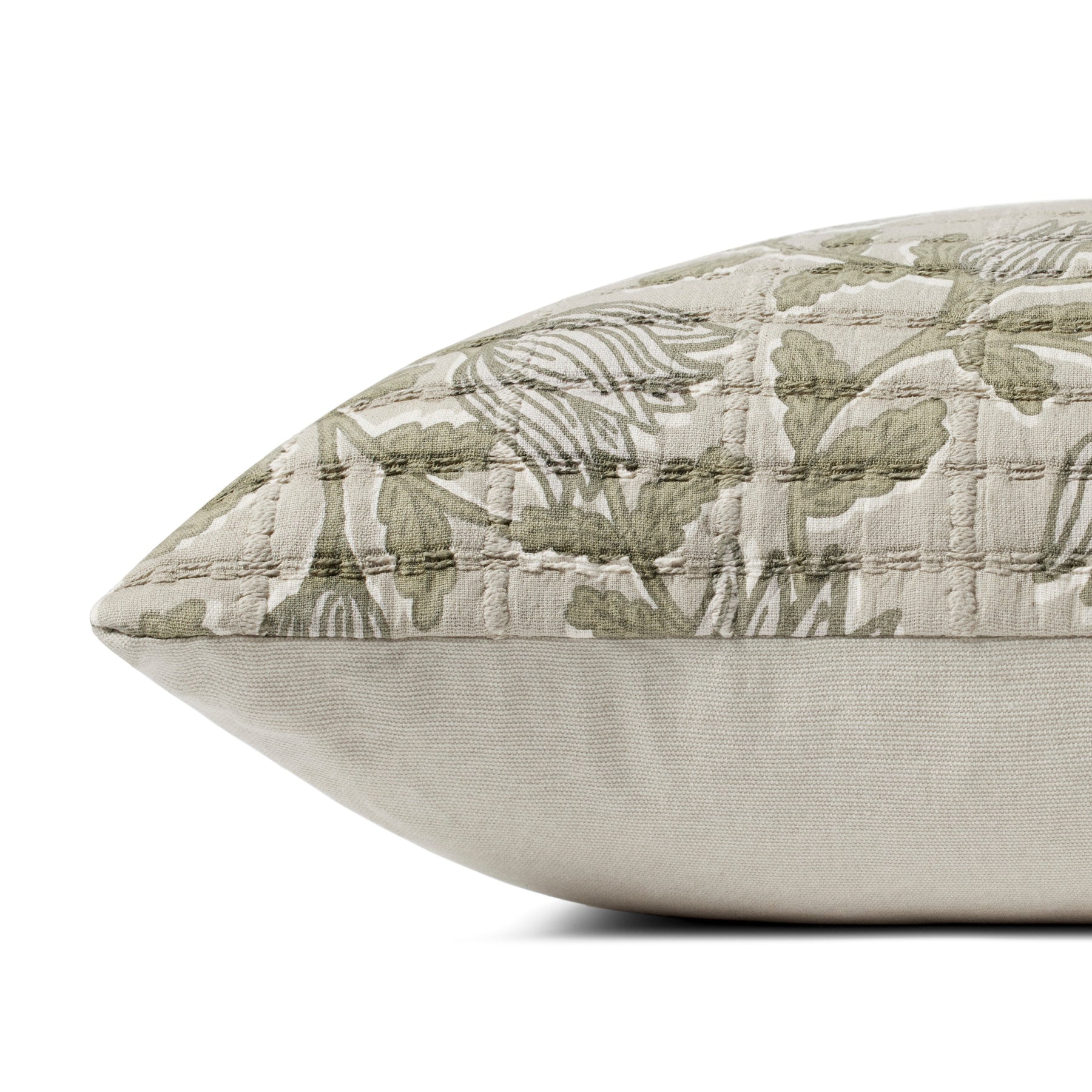 This elegant throw pillow from Jean Stoffer x Loloi features a sage and ivory floral pattern with a soft quilted texture. The pillow cover is made of cotton and measures 16” x 26”, an inviting, larger size to style in living rooms and bedrooms.
