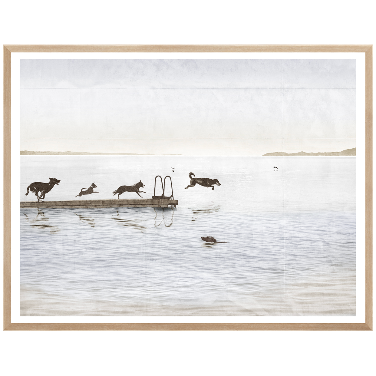 A fun-filled procession of joyful dogs leaps headlong off the edge of a dock in this charming aged photograph. The soft taupe and blue tones combine with a creased paper texture to create a dreamy image full of nostalgia.