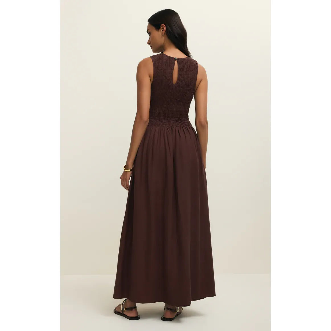 Crafted from a washed linen blend, this maxi dress stuns with its elastic bodice and full yet lightweight skirt. Its day-to-night versatility makes it a wardrobe classic.