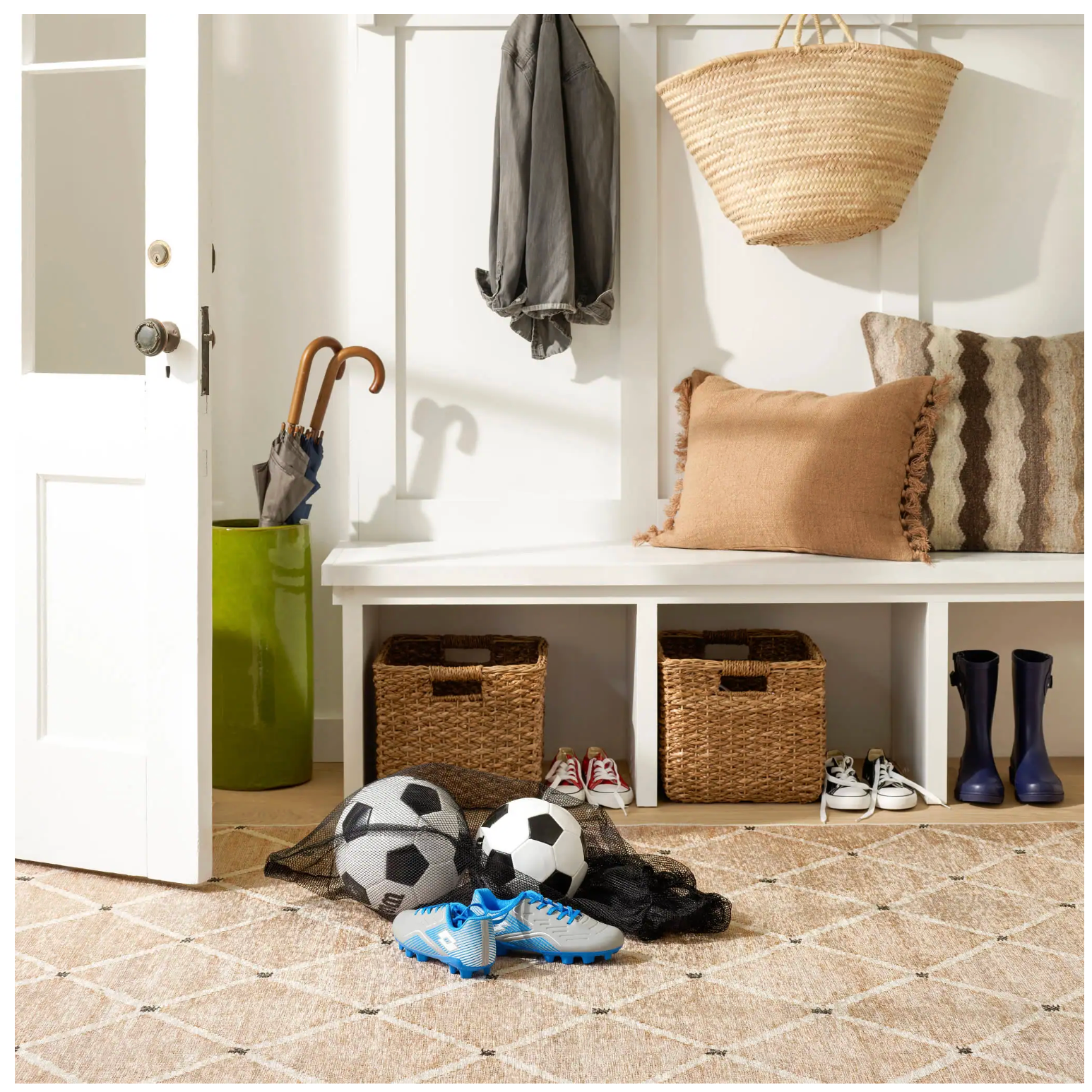 We've taken one of our most popular jute rug weaves and translated it into this chic, machine-washable rug. The simple latticework pattern, punctuated by charcoal dots at the crisscross, makes a convenient and eye-catching option anywhere you need an easy-to-clean rug. Great for homes with pets and high-traffic areas like entryways, mudrooms, and kitchens. After washing, remove the rug from the machine promptly and lay flat for best results.