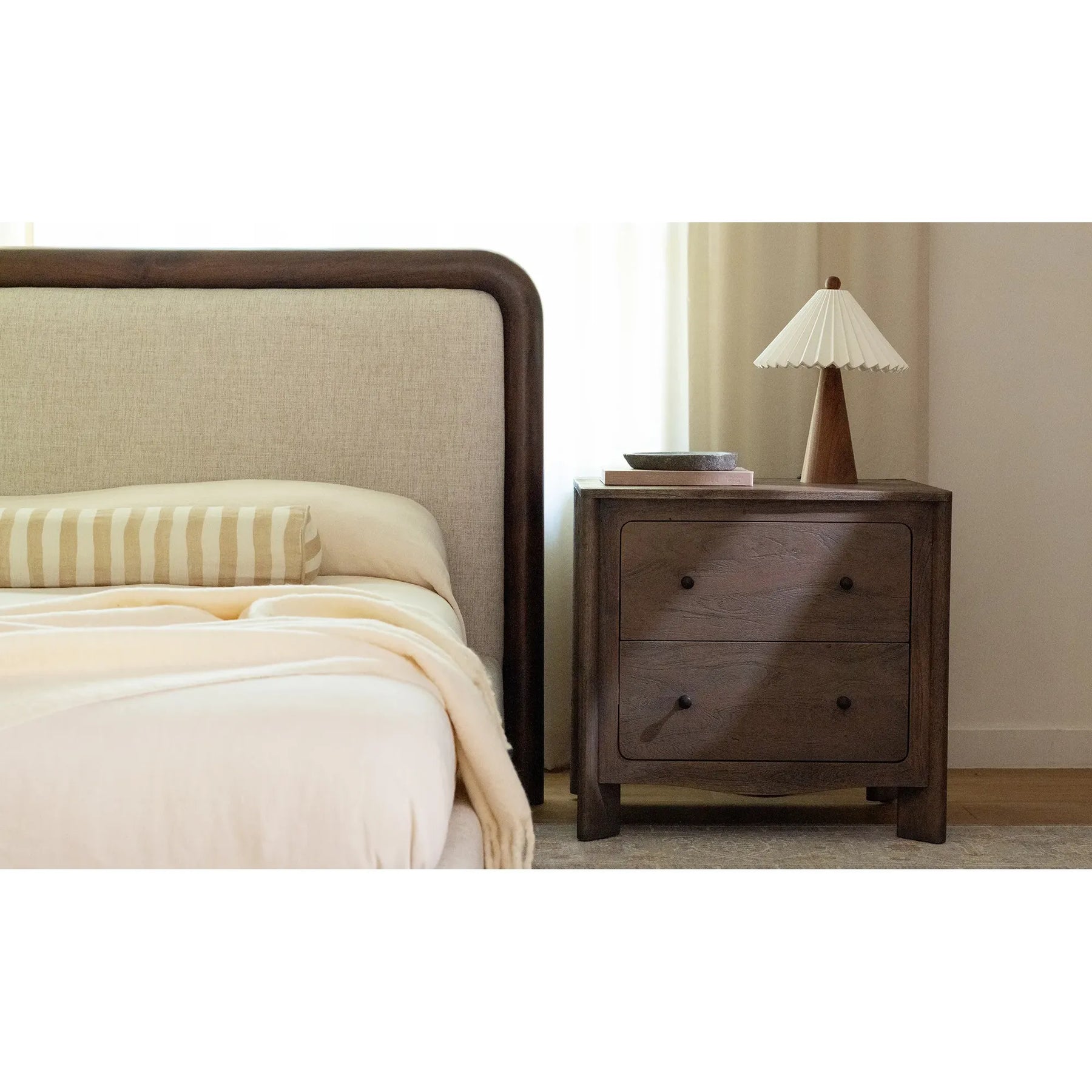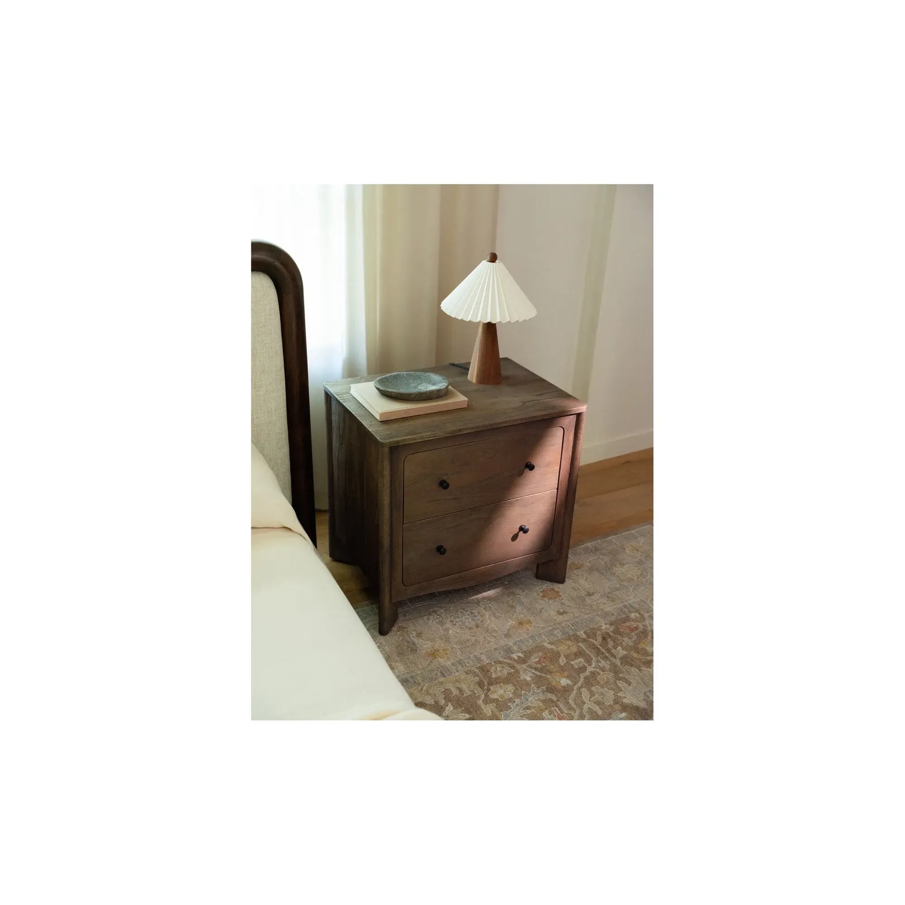Curve meets edge. Mabel is all about sculptural detail done right. A curved base gives a subtle nod to tradition, while inverted diagonal legs add lift and a modern twist. The wire-brushed Acacia brings out texture and tone, highlighting the wood’s natural grain. Compact, confident, and grounded by design.