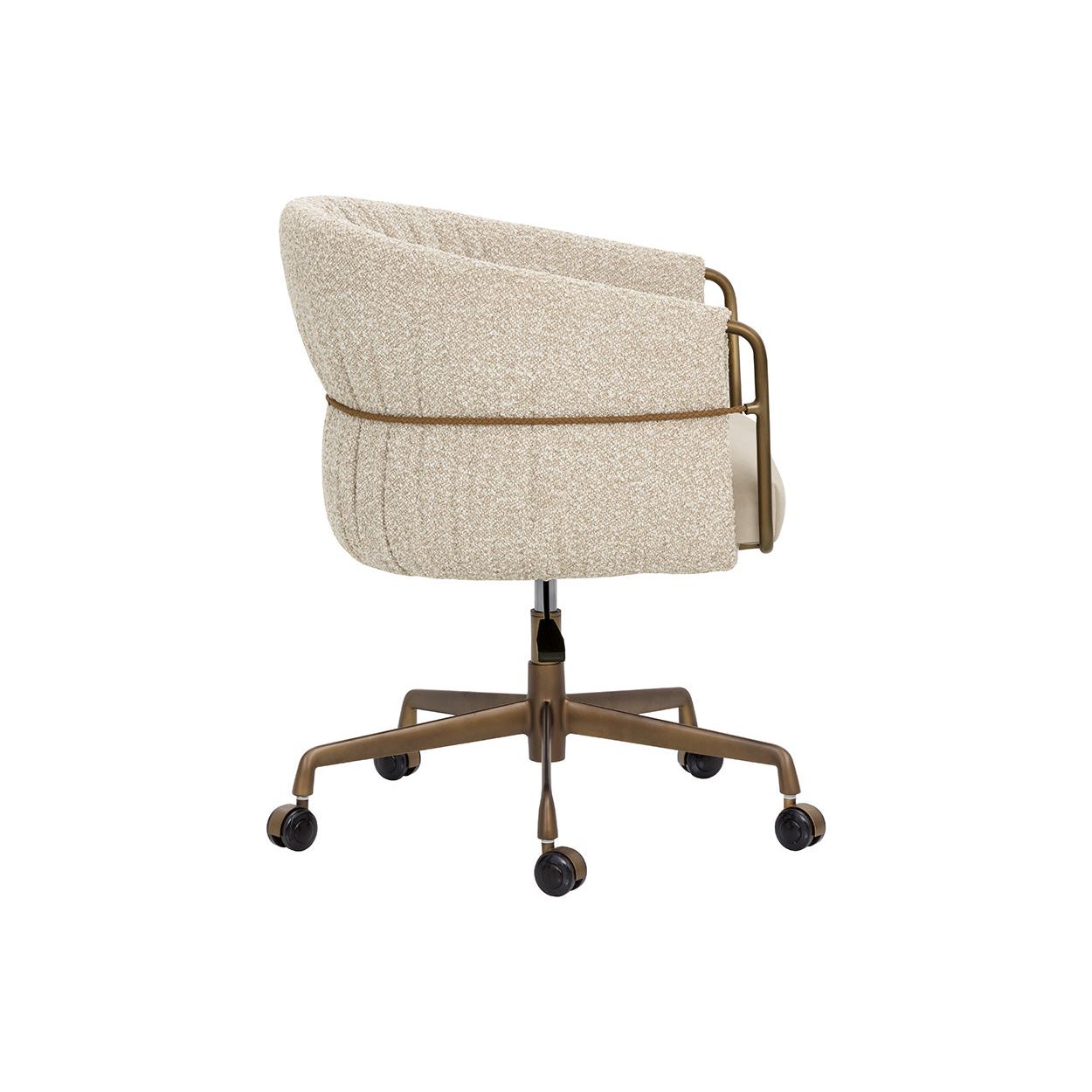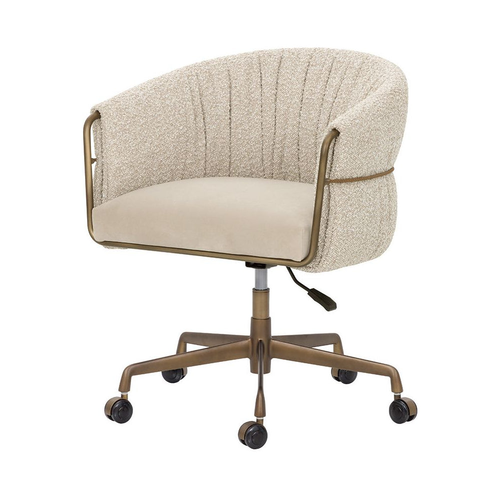 The Olma Office Chair is a balance of comfort and utility. Its curved backrest is upholstered in plush santa cruz oatmeal fabric, contrasted by a smooth meg taupe seat. A slim woven rope accent traces the iron frame, while the fabric subtly folds and wraps around the arms, leaving portions of the frame exposed for a layered look. A rustic bronze steel base completes the design.