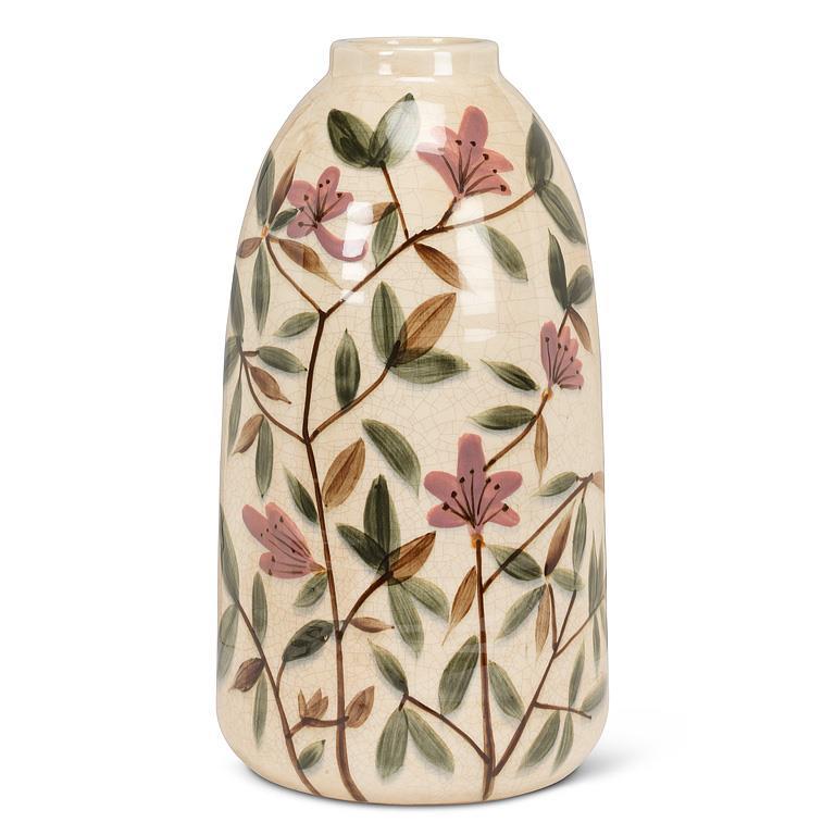 Graceful and softly expressive, this stoneware vase features hand-painted botanical branches dotted with muted pink blossoms and layered green leaves, all set against a warm, crackle-glazed ground. The gently rounded silhouette and artisanal finish give it an easy elegance that works beautifully on its own or filled with fresh stems, dried florals, or faux botanicals.