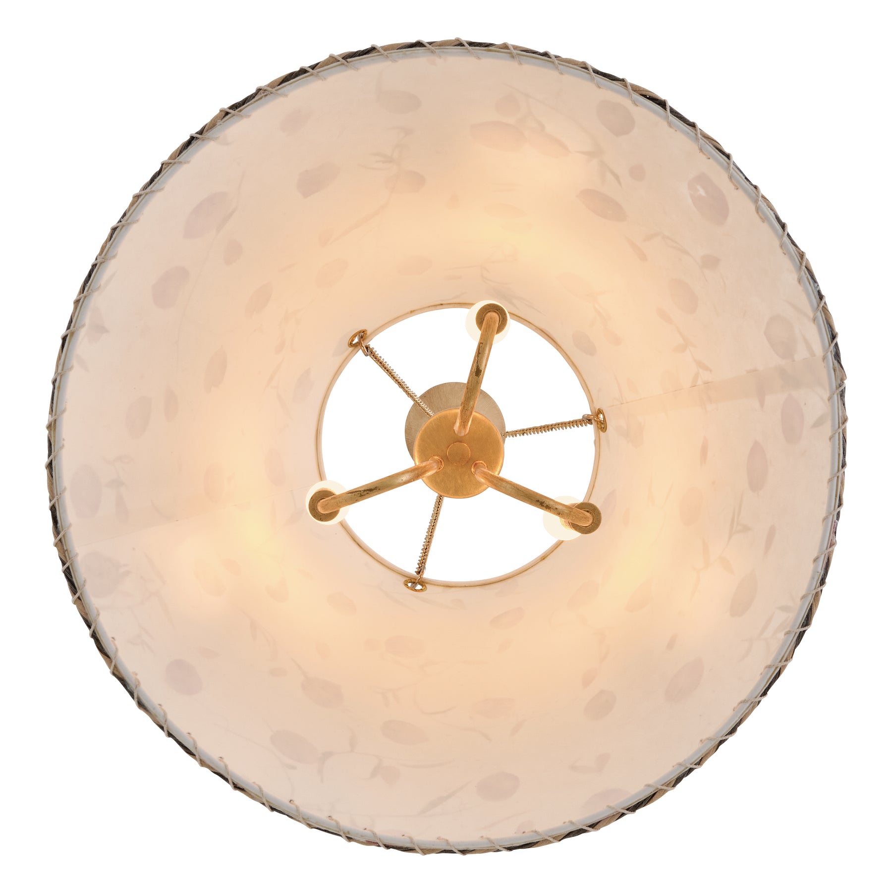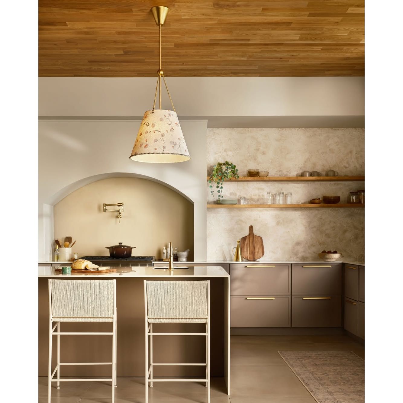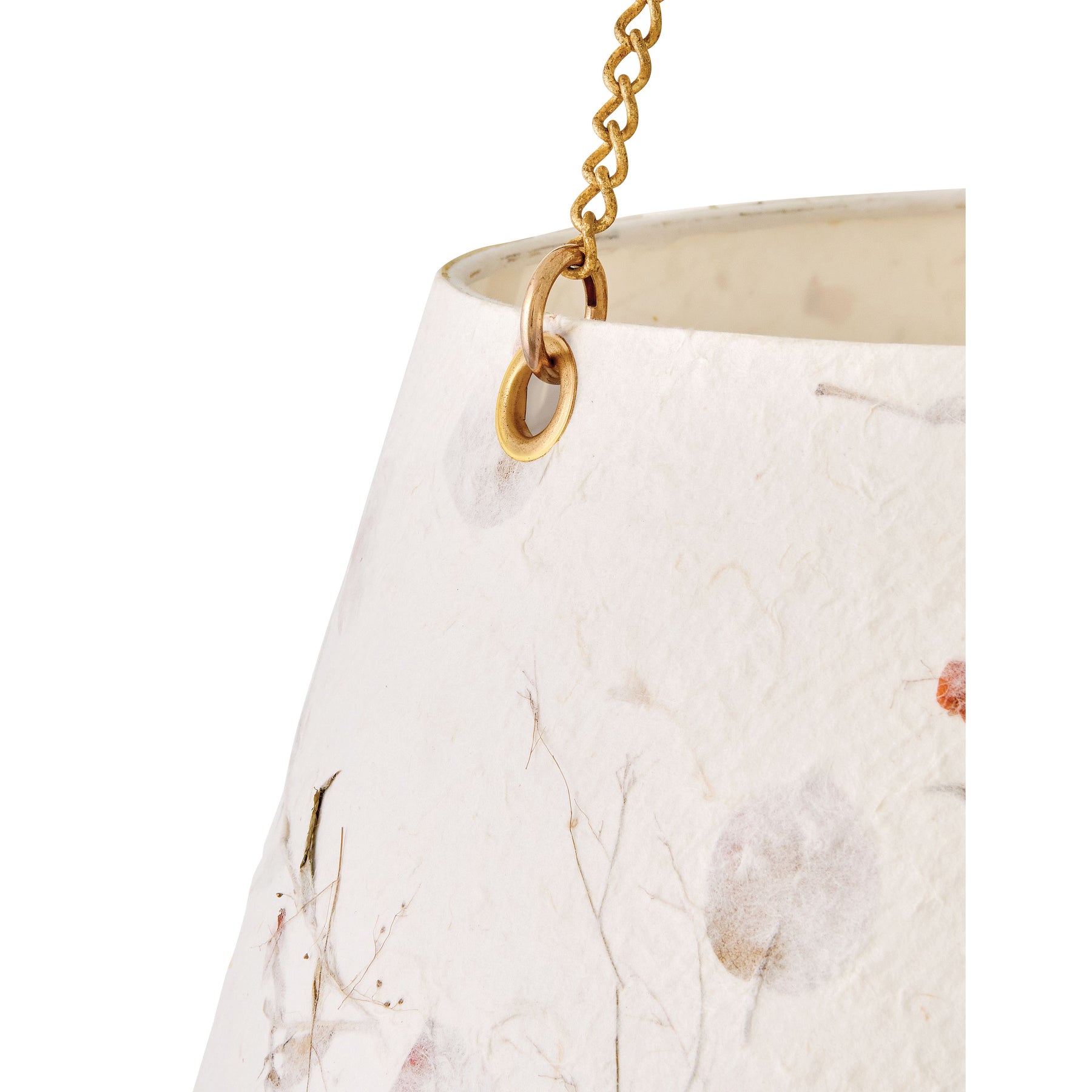 Artisan-crafted from handmade paper pressed with real flowers, Primrose’s delightful shade with twisted rope detailing brings truly unique beauty and cozy ambiance to your space. Its elegant conical silhouette is suspended gracefully from delicate chains, enhanced by a warm Distressed Brass finish.