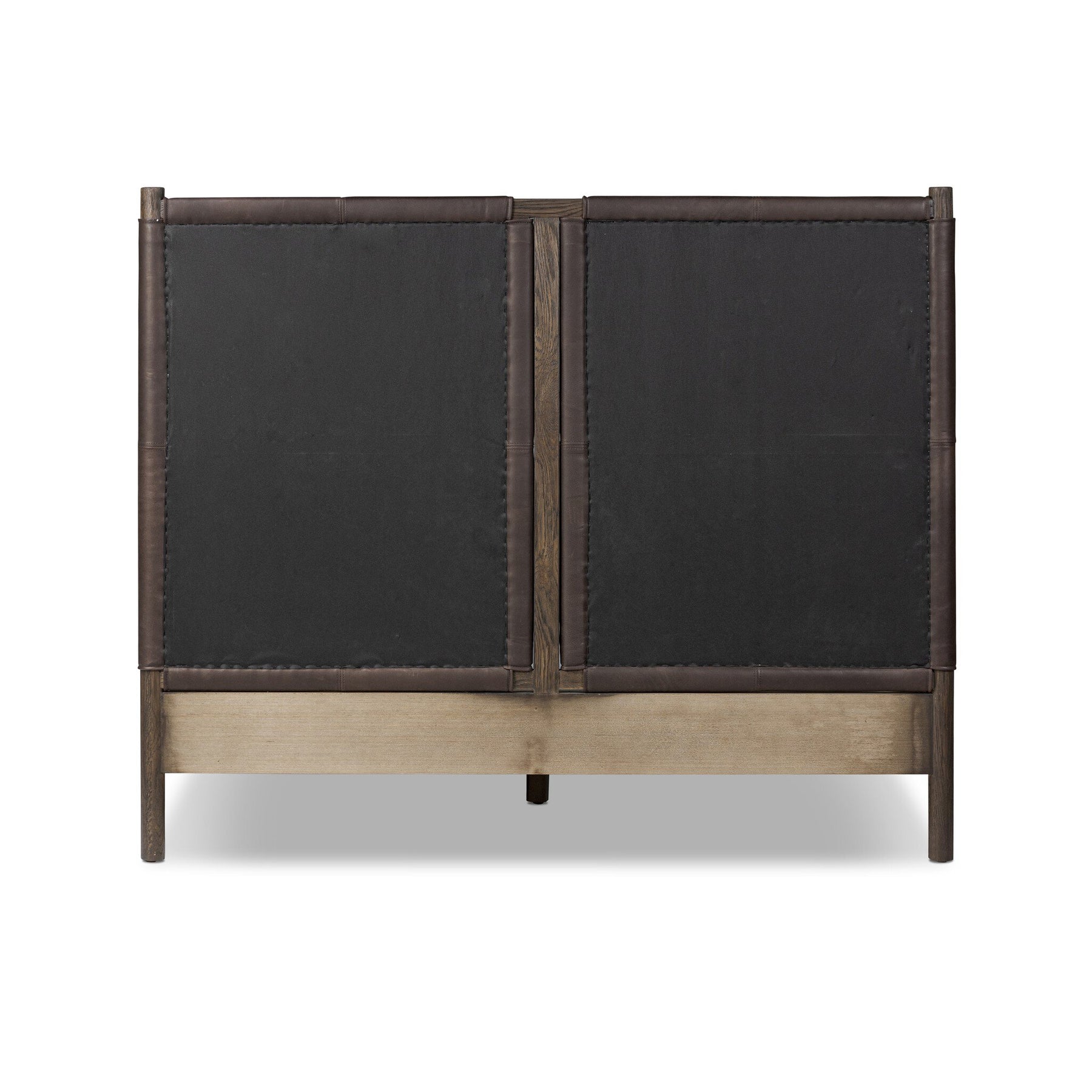 Rubbed black oak framing and heirloom leather panel details craft this safari-inspired queen and king bed frame. Sourced from one of the oldest family-owned tanneries in Italy’s Bassano del Grappa, our deep brown heirloom leather covering is salvaged and processed from upcycled hides featuring an abundance of natural markings, scars and color variations. The result? Beautifully supple, buttery soft hides with an unmatched depth of color and richness, and an authentic lived-in look.