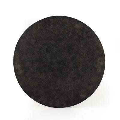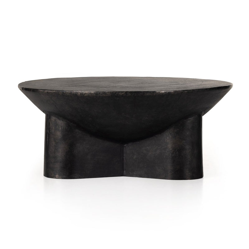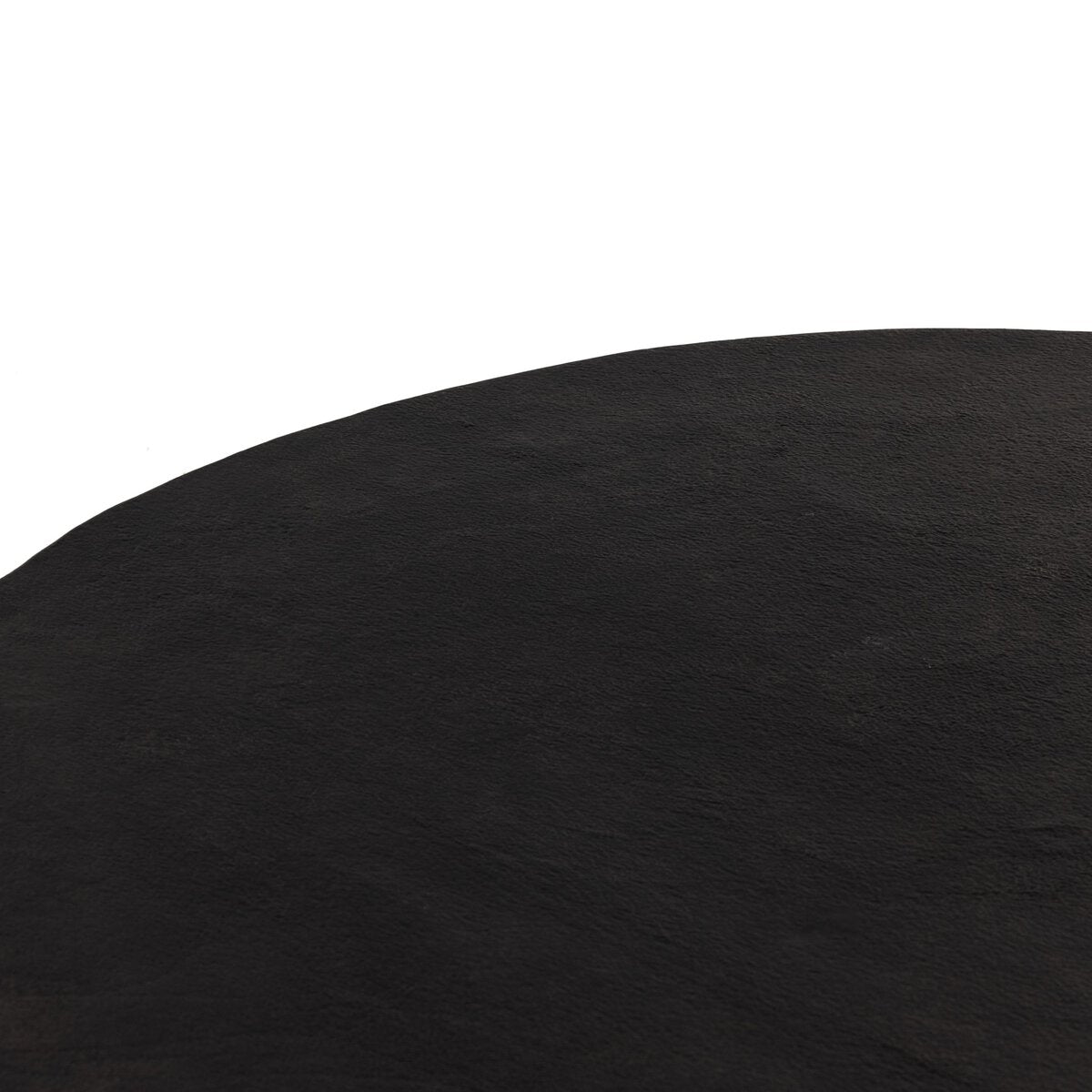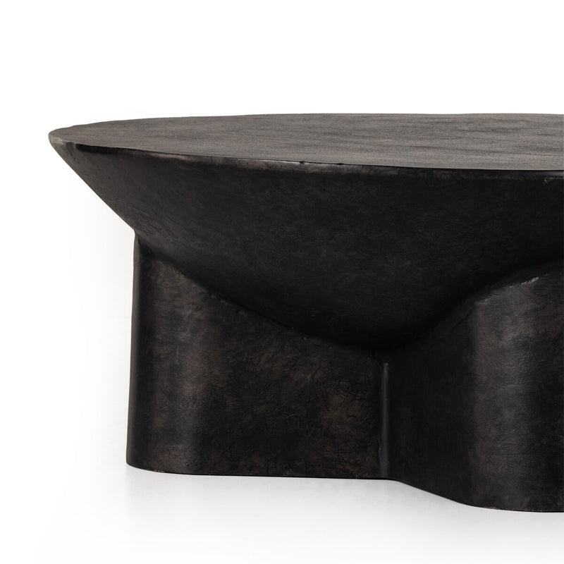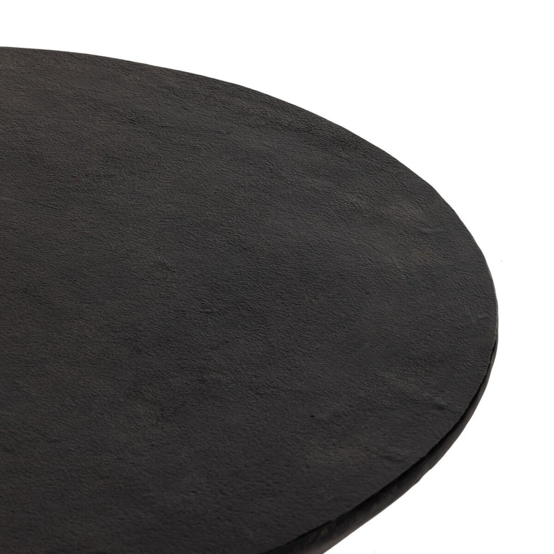 Made from cast aluminum with a raw black finish, a soft, voluminous Y base supports a drum-style tabletop with natural highs and lows.
