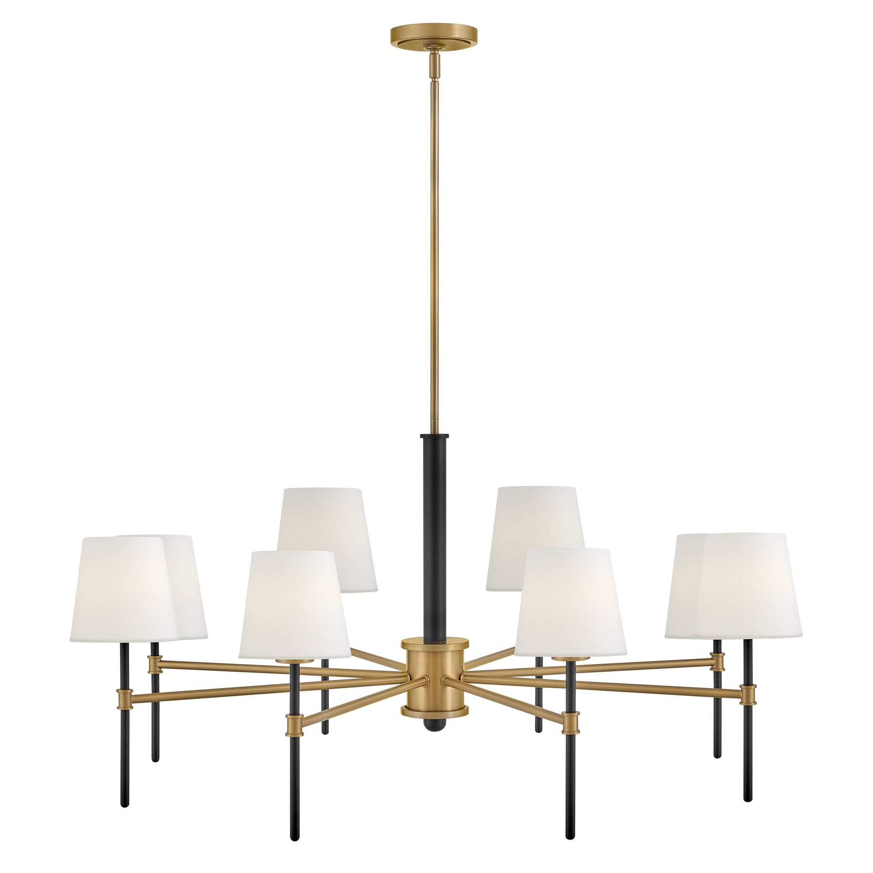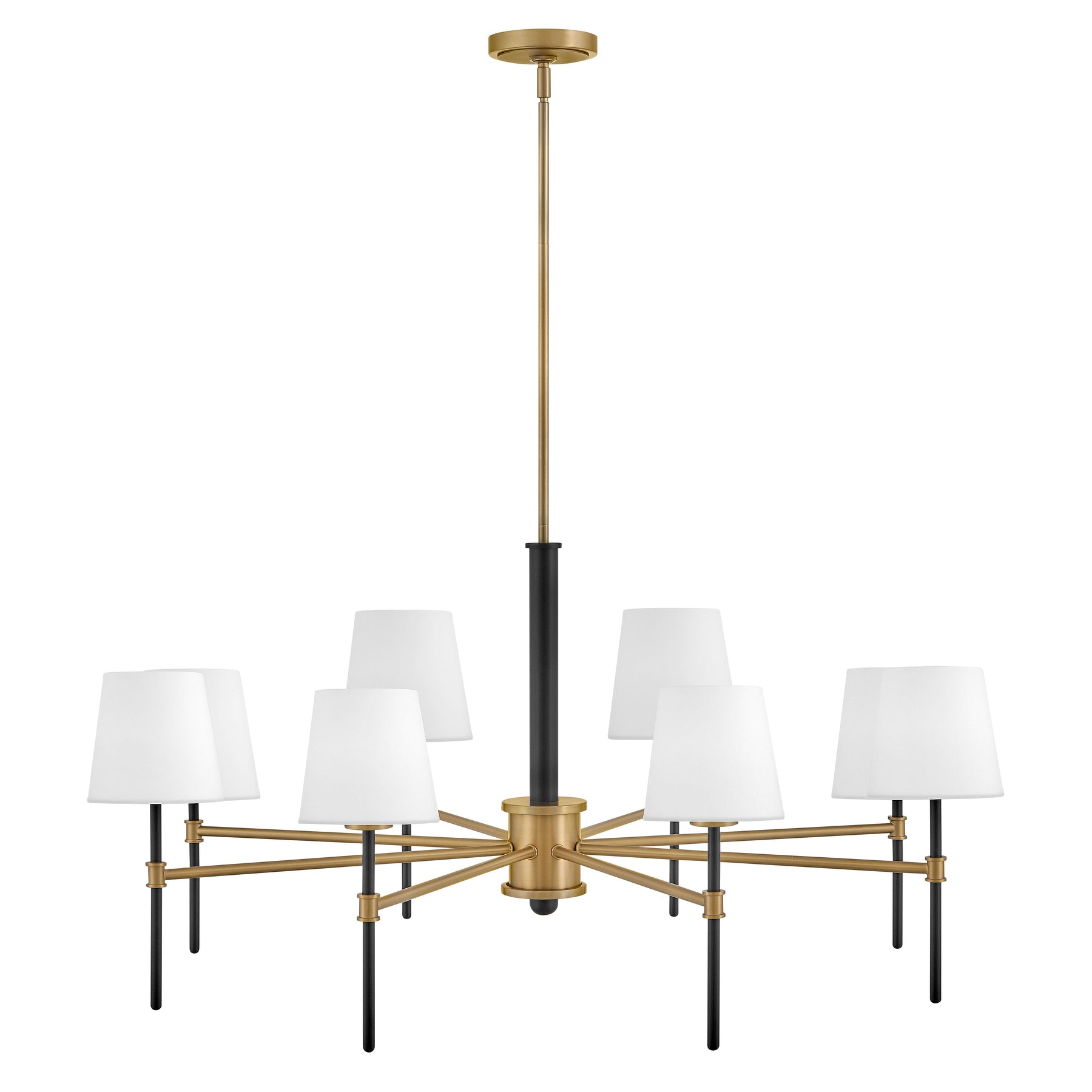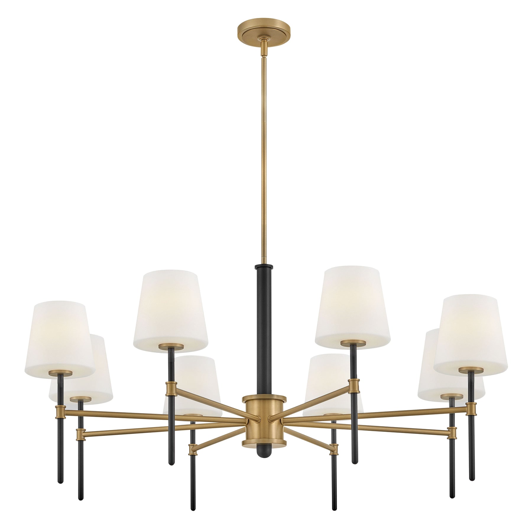 Saunders boasts a striking yet effortless appeal, blending traditional elements with captivating, midcentury modern details. A spoked silhouette and decorative stem holders are finished in Black and Lacquered Brass, paired with blown, etched opal glass shades.
