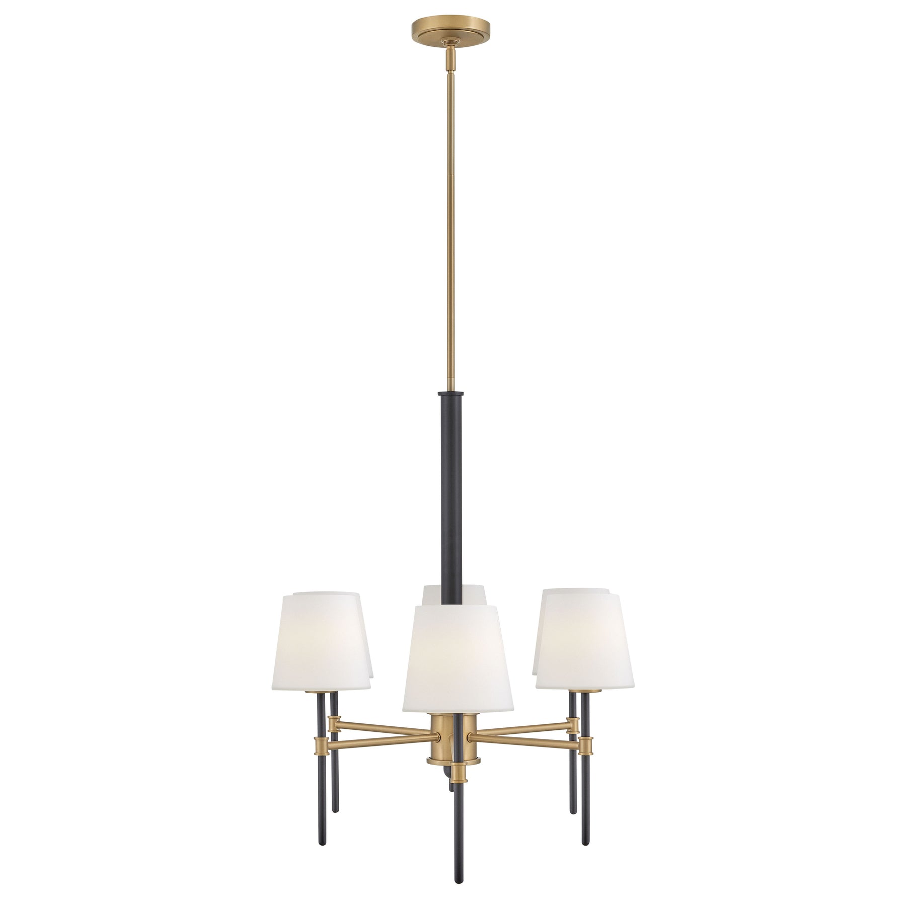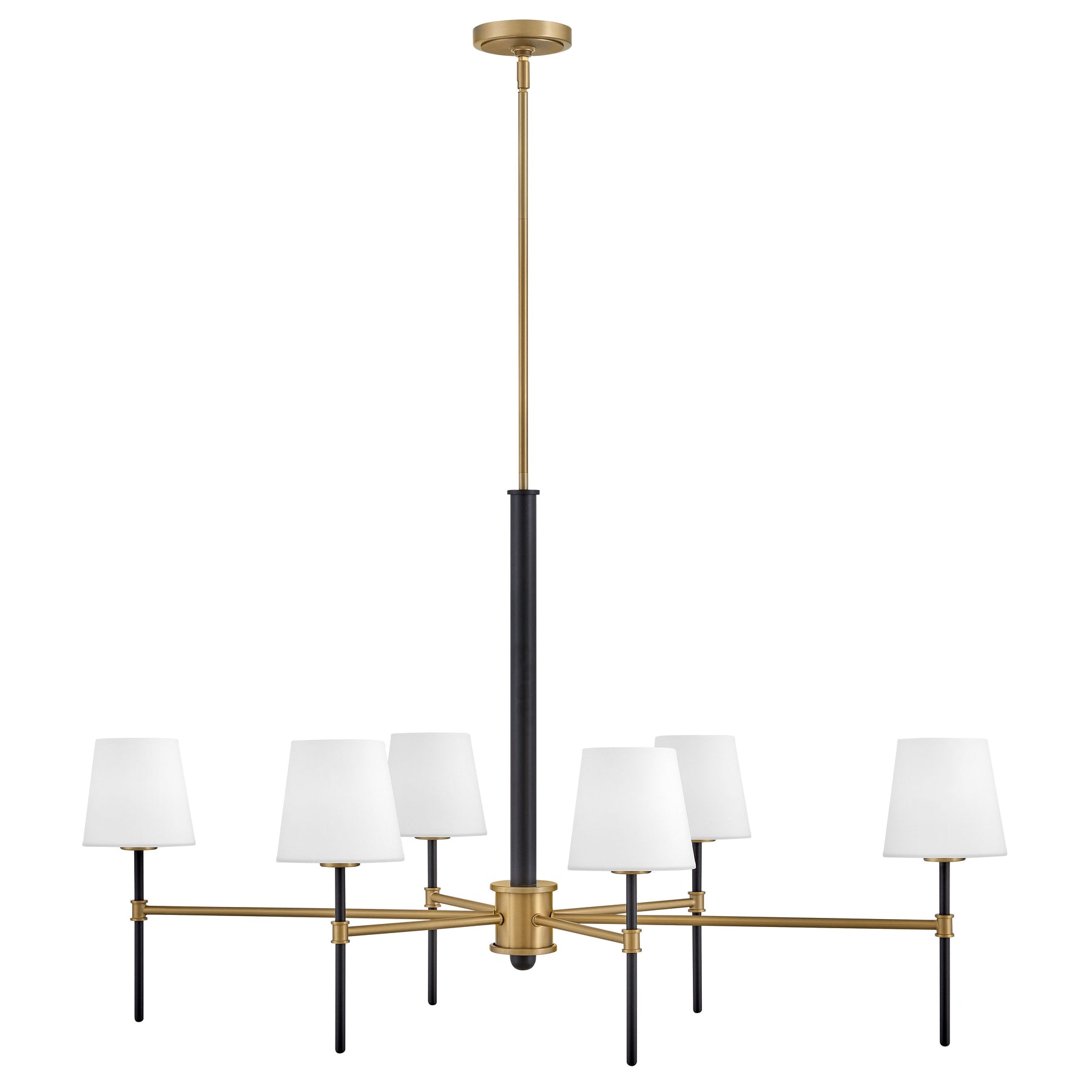 Saunders boasts a striking yet effortless appeal, blending traditional elements with captivating, midcentury modern details. A spoked silhouette and decorative stem holders are finished in Black and Lacquered Brass, paired with blown, etched opal glass shades.