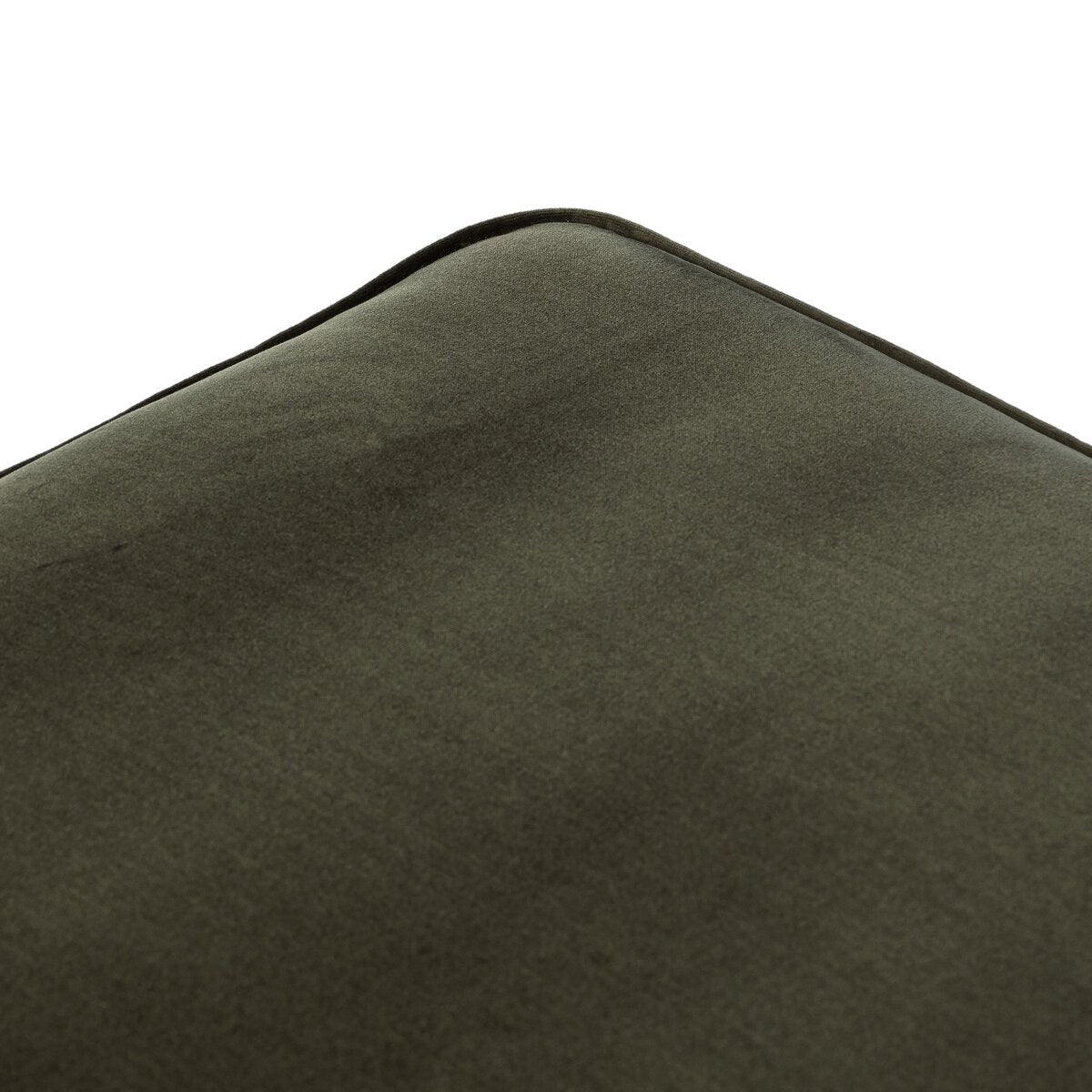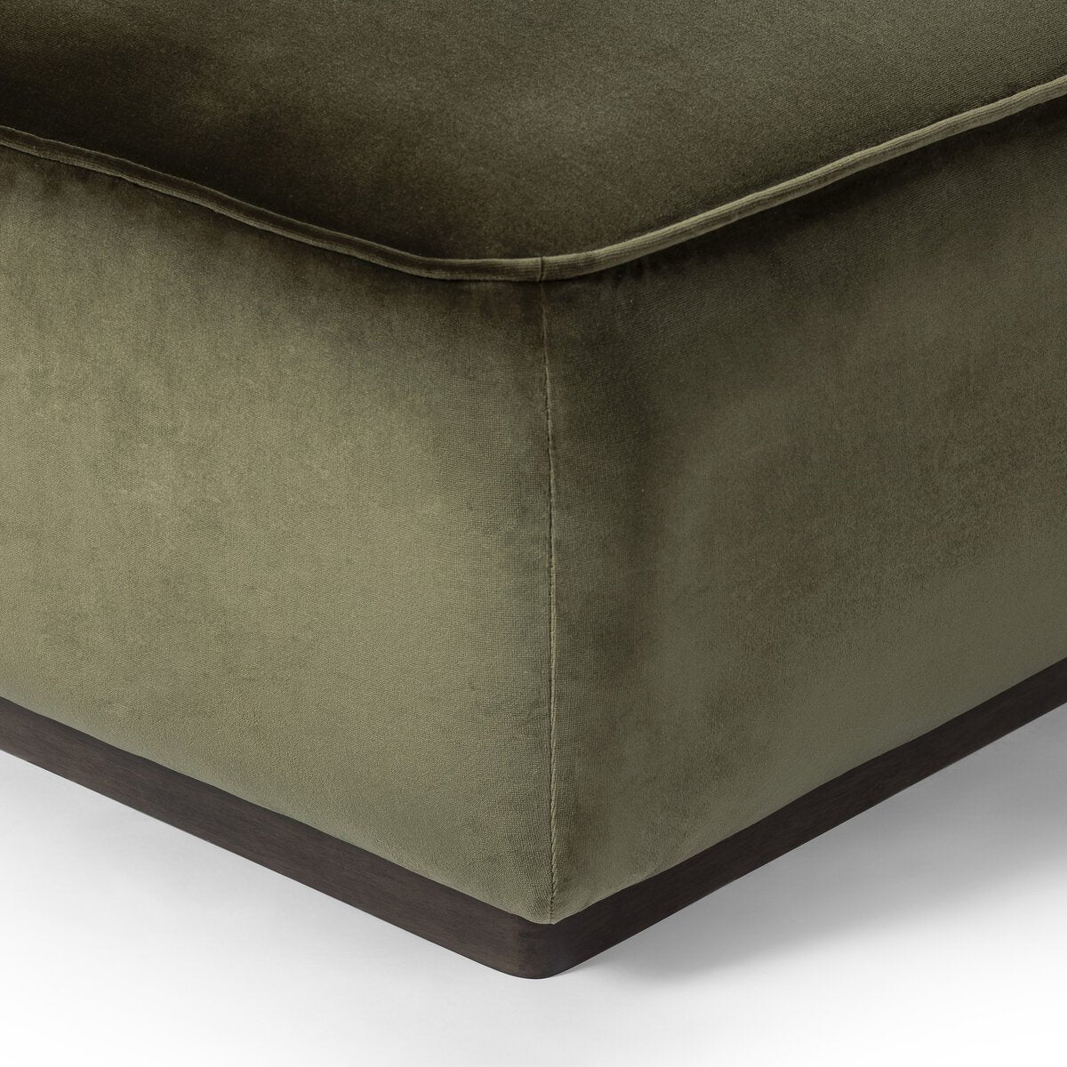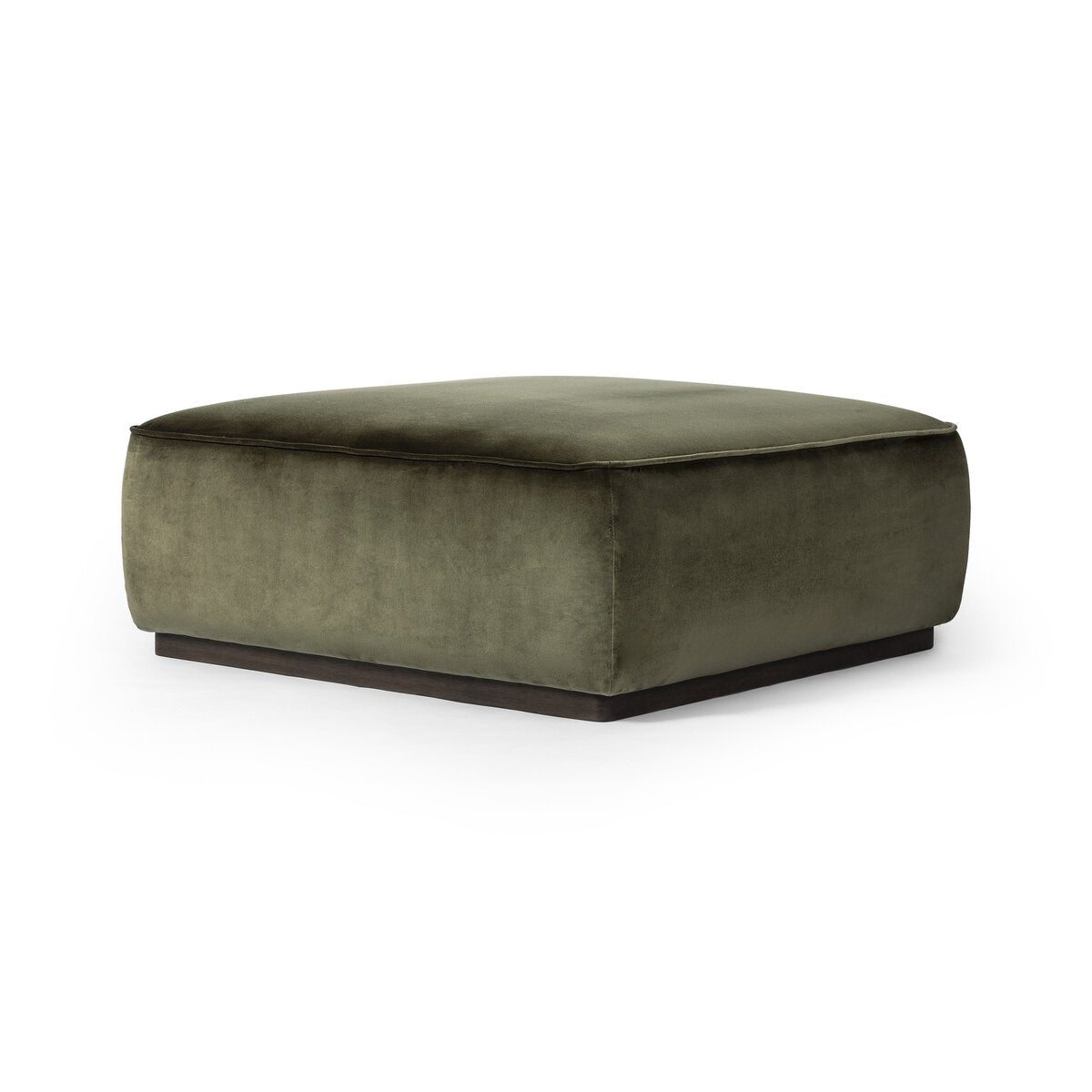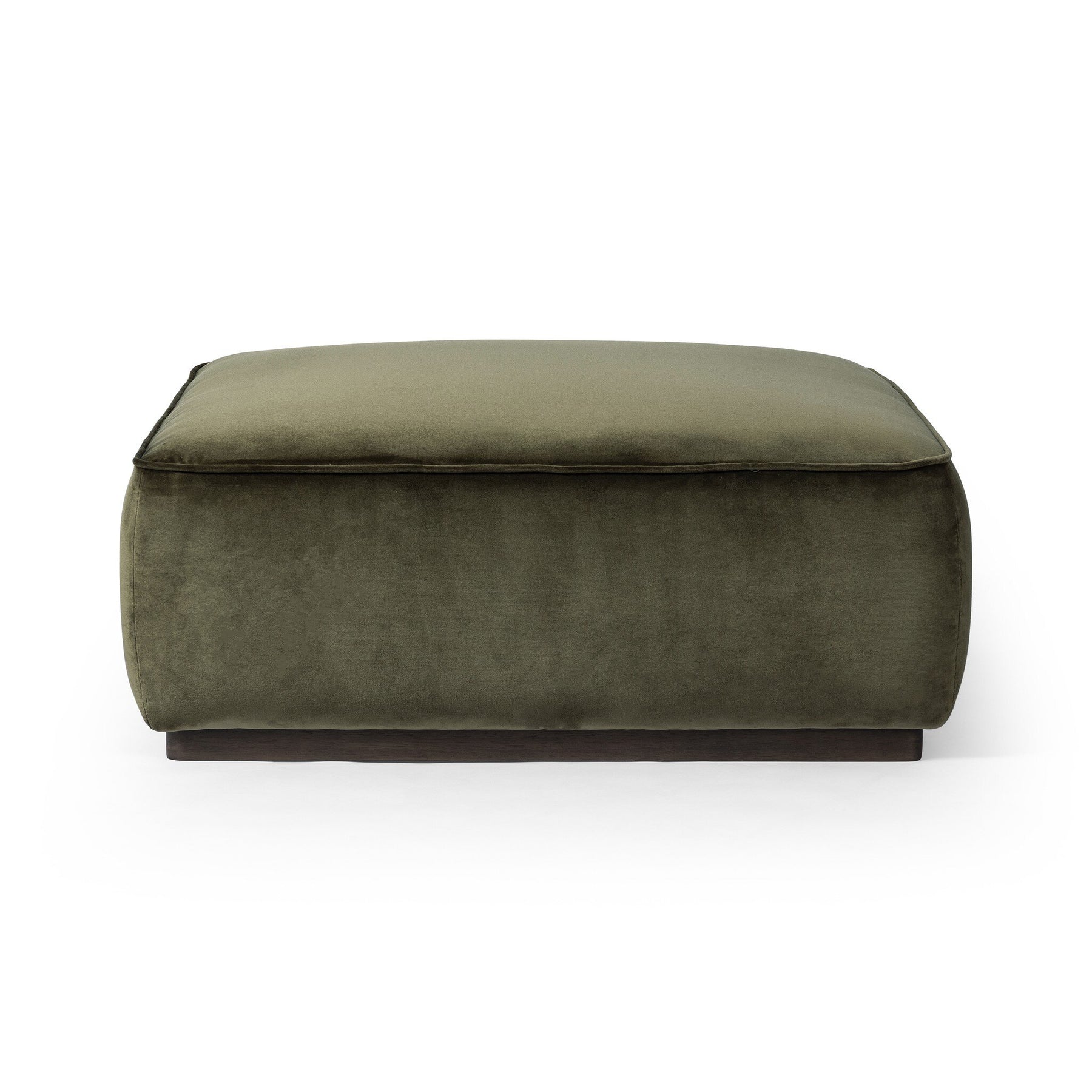 Upholstered in a deep olive velvet paired with a solid brown wood base, this 36" square ottoman can be placed just about anywhere – bringing with it a luxe vibe. Style with a tray as a design-forward coffee table.
