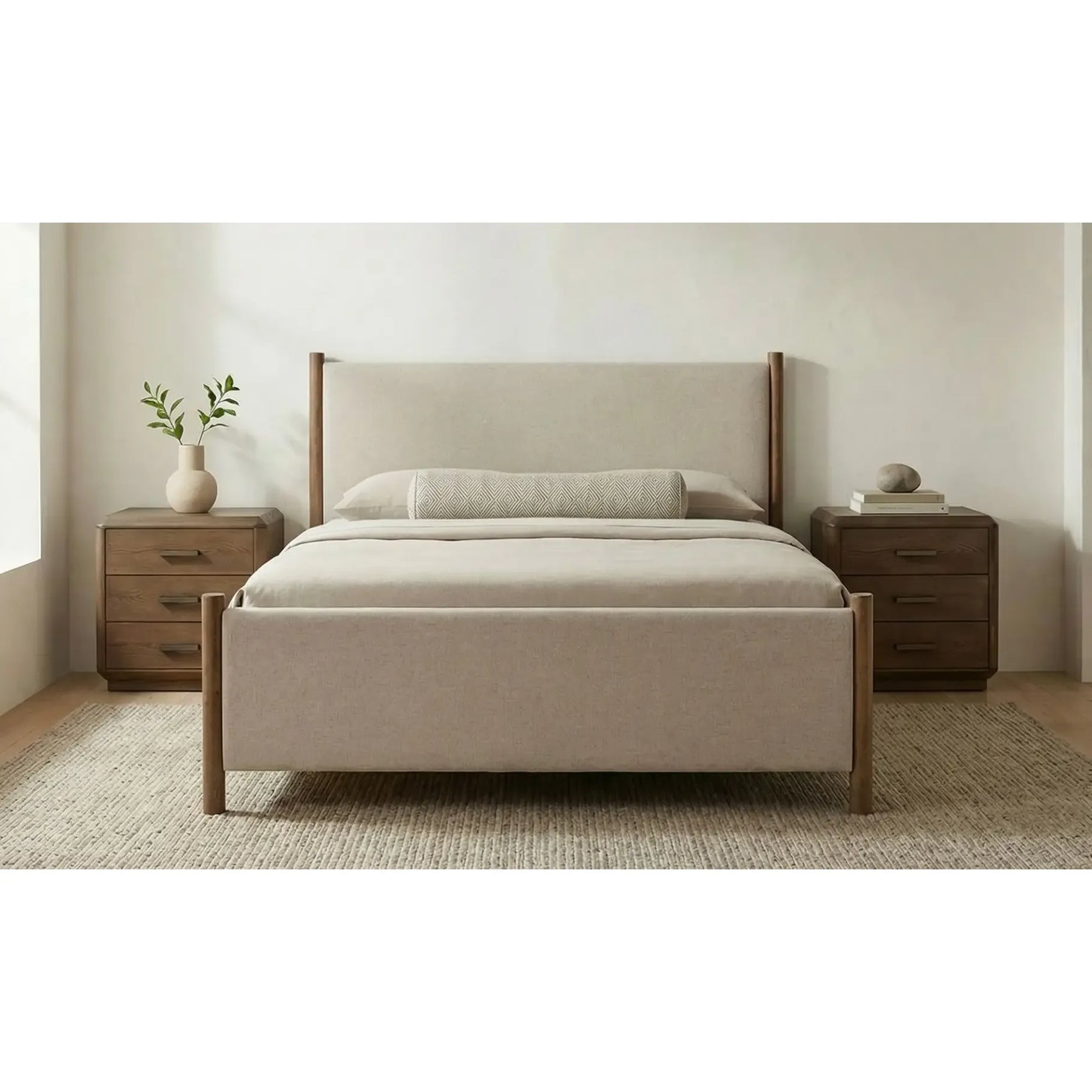The Warren bed's classic four-post design exudes warmth and sophistication, crafted from robust rubberwood with a rich midtone brown stain. The plush, upholstered headboard, wrapped in soft polyester fabric, invites touch and creates a serene focal point, transforming the bedroom into a sanctuary of understated luxury and restful comfort.